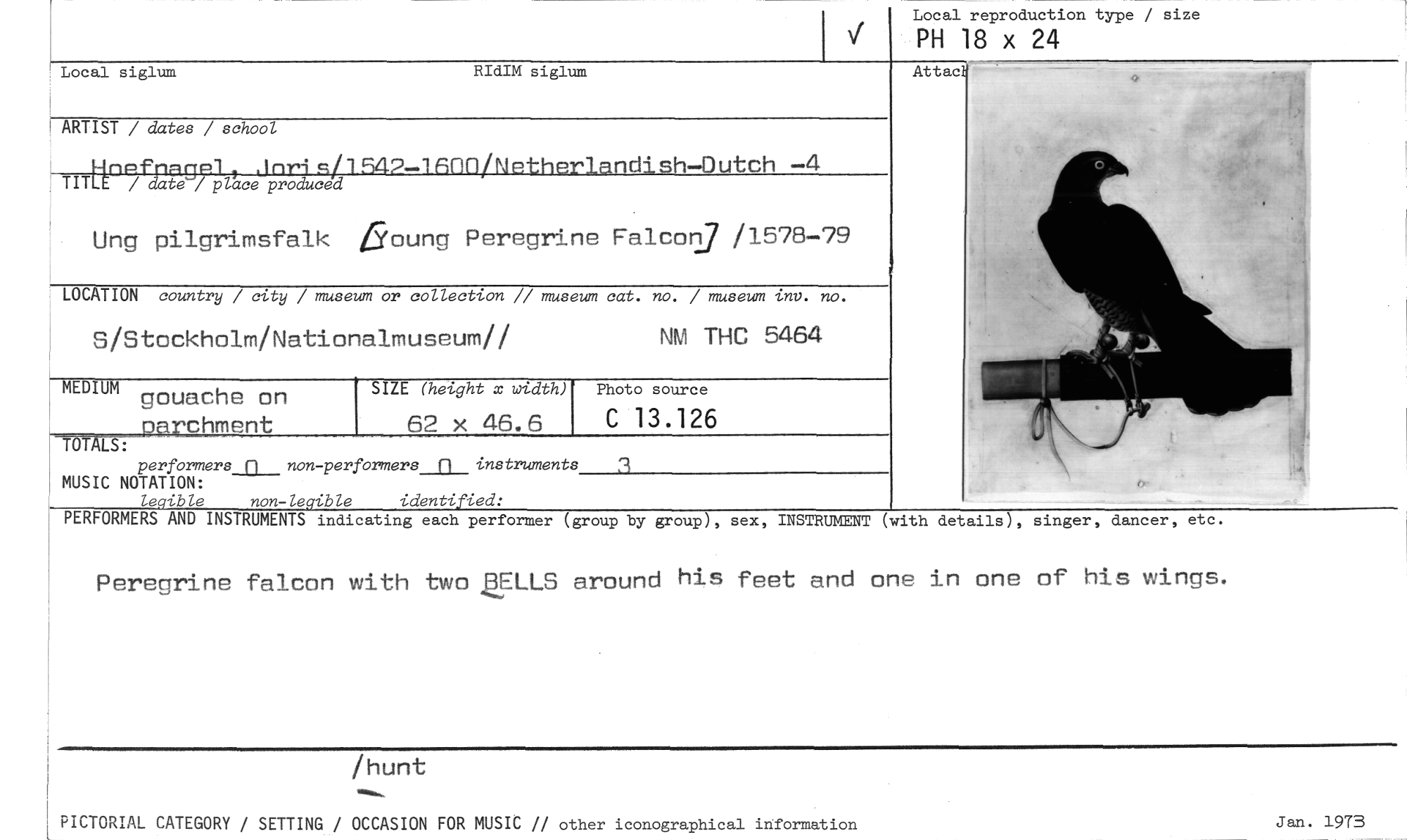 //// Local reproduction type / size //// PH 18 x 24 //// Local siglum RIdIM siglum //// ARTIST / dates / school //// hppfnagel, jnris/lS42-1ffin/Netherlandish—Outch —4 //// TITL / date / place produced //// Ung pilgrimsfalk äoung Peregrine Falcon? /1578-79 //// LOCATION country / city / museum or collection // museum cat. no. / museum lxv. no. //// S/Stockholm/Nationalmuseum// NAR THC 5464 //// SIZE (height x width) //// C 13.126 //// group), sex, INSTRUMENT (with details), singer, dance e //// Peregrine falcon with two,ULLS around his feet and one in one of his wings. //// /hunt //// Attac //// MEDIUM gouache on //// archment //// -17".fflA=S»3 //// performers n non-performers__CL_ instruments MUSIC NOTATION: //// le ible non-le.ible identi ied: //// PERFORMERS AND INSTRUMENTS indicating each performer (group by //// 62 x 46.6 //// Photo source //// PICTORIAL CATEGORY / SETTING / OCCASION FOR MUSIC // other iconographical information //// Jan. 1973 ////