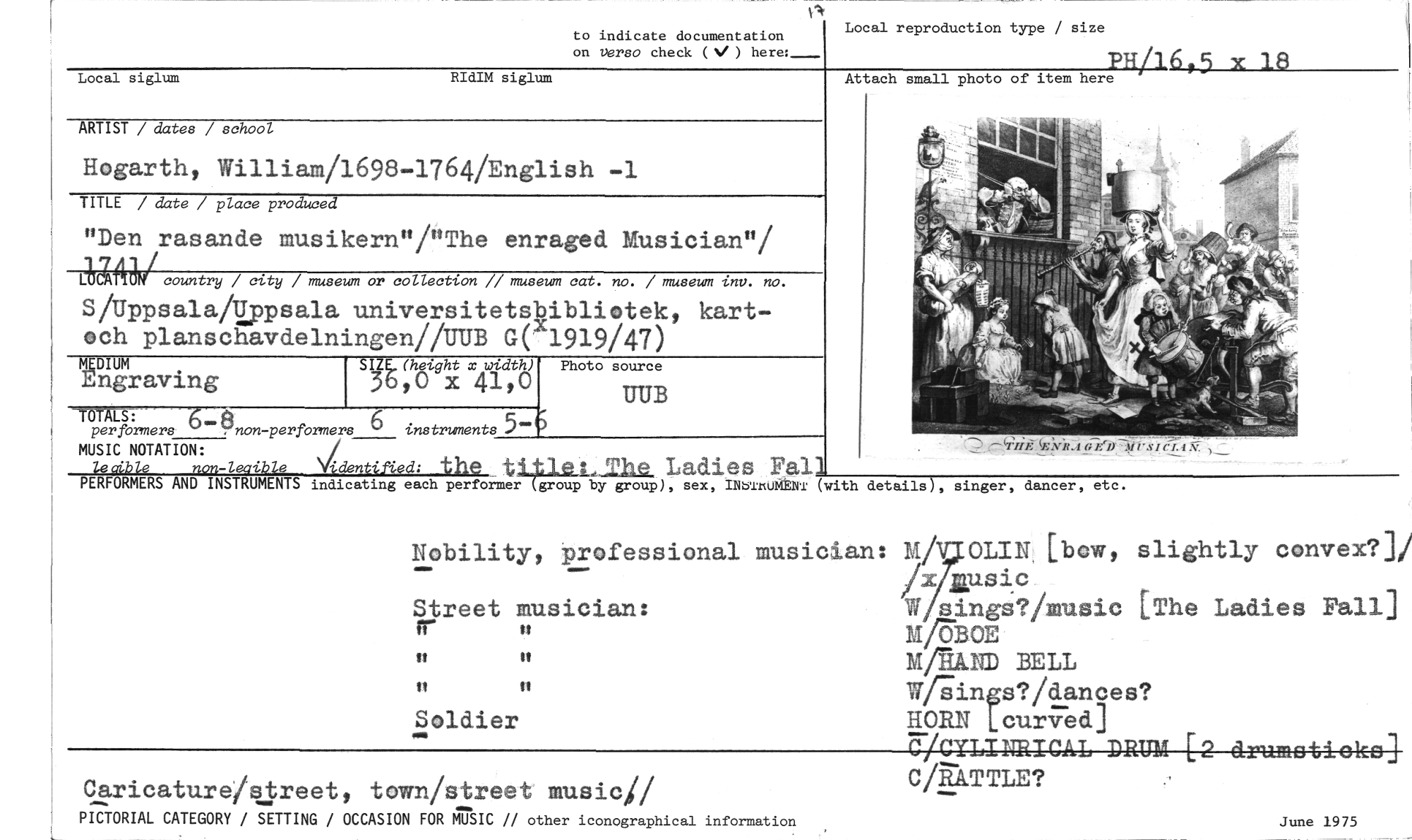 //// to indicate documentation Local reproduction type / size //// on versa check (V ) here:_ //// Local siglum RIdIM siglum //// ARTIST / dates / school //// Hogarth, William/1698-1764/English -1 //// TITLE / date / place produced //// "Den rasande musikern"/"The enraged Musician"/ //// Mig/country / city / museum or collection // museum cat. no. / museum inv. no. //// S/uppsala/Uppsala universitetsbibliotek, kart- och planschavdelningen/PUB Gec1919/47) //// MEDIUM" SIZ5.(hgight x width) Photo source //// ngraving 30,0 x 41,0 //// UUB //// TOTALS: 68 //// per formers -, non-performers 6 instruments 5- //// lesible non-leaible lidentified: //// MUSIC NOTATION: //// the tLtle.:,Mae. Ladies Fal //// PERFORMERS AND INSTRUMENTS indicating each performer (group by group), sex, INbluluM/NT (with details), singer, dancer, etc. //// 211716,5 x 18 //// Attach small photo of item here //// Nobility, professional Street musician: //// tt //// tt tt //// Soldier //// os //// musician: M/ OLIN.[bow, slightly convex?]/ /x.1sic //// W sings?imusic [The Ladies Fall] M/i5BOE //// Mir= BELL //// Wiigings?/dances? //// HORN Lcurved] //// UICYLIPRICAL DRUM [2 drumetickc] C/RATTLE? //// June 1975 //// Caricatureistreet, town/street music// //// PICTORIAL CATEGORY / SETTING / OCCASION FOR MUSIC // other iconographical information ////