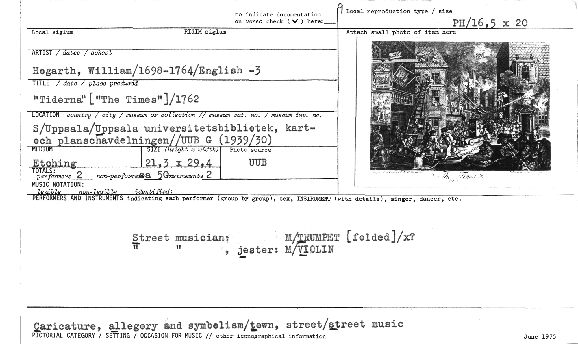 //// to indicate documentation //// on verso check (V) here:__ //// Local siglum RIdIM siglum //// 9 Local reproduction type / size //// PH/16,5 x 20 //// Attach small photo of item here //// ARTIST / dates / school //// Hogarth, William/1698-1764/English - //// TITLE / date / place produced //// "Tiderne["The Times"]/1762 //// LOCATION country / city / museum or collection // museum cat. no. / museum tnv. no. //// S/Uppsalatgypsala universitetsbibliotek, kart- //// och planschavdelningen//UUB G (1939/30) //// MEDIUM SIZE (height x width) Photo source //// Et hjjag 21,3 x 29,4 //// TOVES: //// per formers 2 non-performeitra 5Qnstrwnents 2 //// UUB //// MUSIC NOTATION: //// Zeoible non-leaible identified: //// PERFORMERS AND INSTRUMENTS indicating each performer (group by group), sex, INSTRUMENT //// (with details), singer, dancer, etc. //// Street musician: UMPET [folded]/x? //// jester: M VIOLIN //// Caricature, allegory and symbolism/Ipwn, street/street music //// ITCTORIAL CATEGORY / SETTING / OCCASION FOR MUSIC // other iconographical information //// June 1975 ////