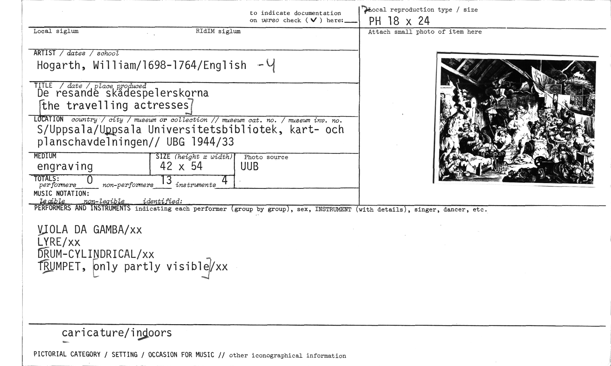 //// to indicate documentation //// on verso check (V ) here: //// `›Eocal reproduction type / size //// PH 18 x 24 //// Attach small photo of item here //// Local siglum //// IdIM siglum //// ARTIST / dates / school //// Hogarth, William/1698-1764/English //// TITLE / date / place Rroduced //// De resande skadespelerskorna the travelling actressesj //// LCCATION country,/ city / museum or collection // museum cat. no. / museum inv. no. //// S/Uppsala/Upsala Universitetsbibliotek, kart- och planschavdelningen// UBG 1944/33 //// Photo source //// UUB //// MEDIUM SIZE (height x width) //// engraving 42 x 54 //// //// LS: //// per formers non-perfbrme PS 3 instruments //// MUSIC NOTATION: //// leolible non-leaible identilied: //// PERFORMERS AND INSTRUMENTS indicating each performer (group by //// group), sex, INSTRUMENT (with details), singer, dancer, etc. //// IOLA DA GAMBA/xx //// LYRE/xx //// gUM-CYLINDRICAL/xx //// TRUMPET, only partly visiblexx //// caricature/i5Moors //// PICTORIAL CATEGORY / SETTING / OCCASION FOR MUSIC // other iconographical information ////