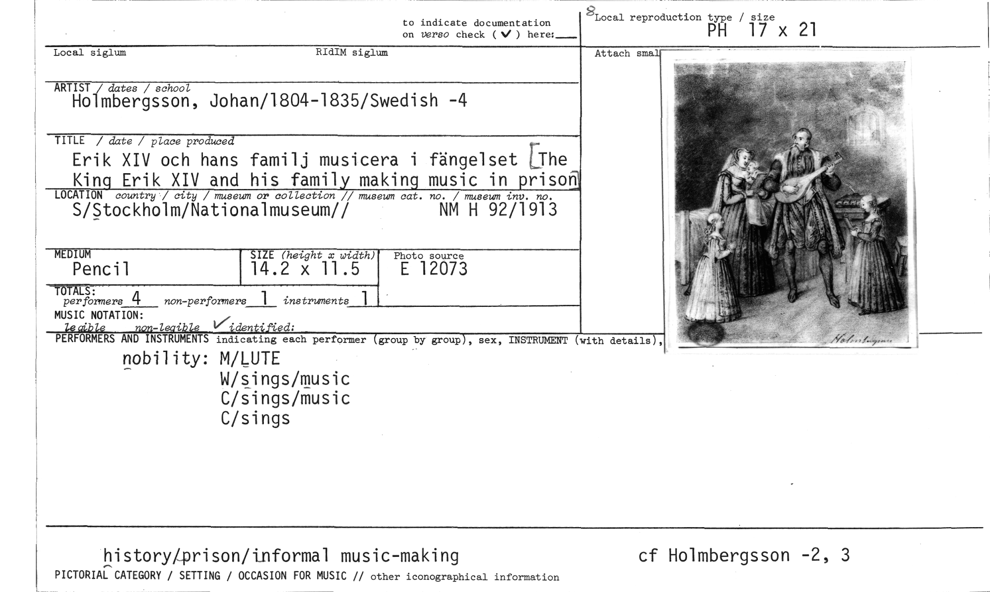 //// to indicate documentation //// on verso check ( ) here:_ //// Local reproduction type / size //// PH 17 x 21 //// Local siglum RIdIM siglum //// ARTIST / dates / school //// Holmbergsson, Johan/1804-1835/Swedish -4 //// TITLE / date / place produced //// Erik XIV och hans familj musicera i King Erik XIV and his family making //// MUSIC NOTATION: //// lecible non-lecible /identified; //// PERFORMERS AND INSTRUMENTS indicating each performer (group by group), //// MEDIUM //// Pencil //// SIZE (hetght x width) //// 14.2 x 11.5 //// lotolsäriå //// per forners 4 non-perforners 1 instruments 1 //// sex, INSTRUMENT (with details), //// fängelset LThe music in prisoR //// LOCATION country / city / museum or collection // museum cat. no. / museum inc. no. //// S/Stockholm/Nationalmuseum// NM H 92/1913 //// nobility: M/LUTE //// W/sings/music C/sings/music C/sings //// Attach smal //// history/prison/informal music-making //// PICTORIAL CATEGORY / SETTING / OCCASION FOR MUSIC // other iconographical information //// cf Holmbergsson -2, 3 ////