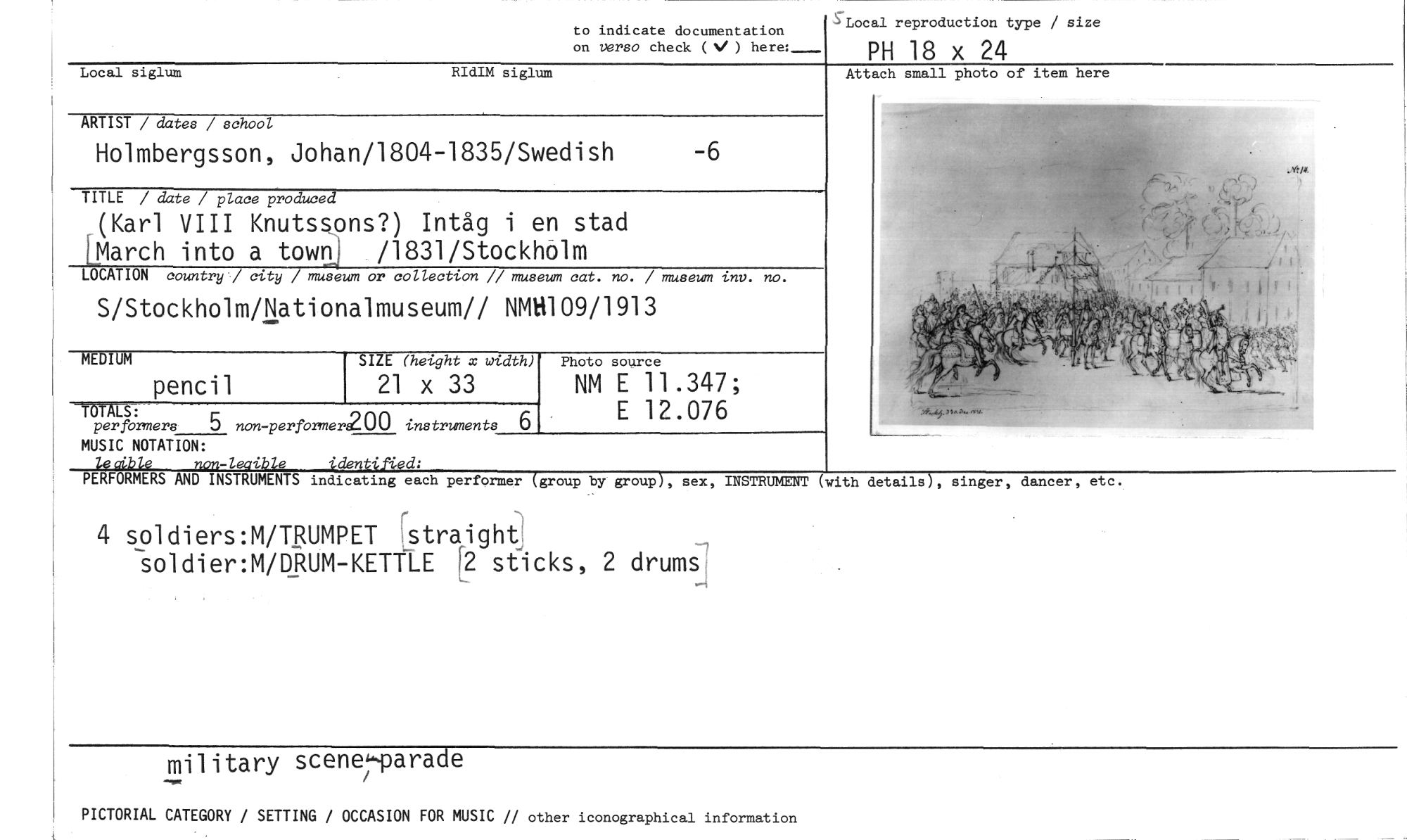 //// to indicate documentation on versa check (N./ ) here: //// 5Local reproduction type / size //// PH 18 x 24 //// Local siglum RIdIM siglum //// Attach small photo of item here //// ARTIST / dates / school //// Holmbergsson, Johan/1804-1835/Swedish -6 //// TITLE / date / place produced //// (Karl VIII Knutssons?) Intåg i en stad //// [March into a townj ./1831/Stockhölm //// LOCATION country / city / museum or collection // museum cat. no. / museum in v. no. //// S/Stockholm/Nationalmuseum// MIM109/1913 //// MEDIUM SIZE (height x width) //// Photo source //// pencil 21 x 33 //// NM E 11.347; E 12.076 //// TOTALS: //// per formers 5 non-perfOrme 2,200 instruments 6 //// MUSIC NOTATION: //// leaible non-leaible identi6ed: //// PERFORMERS AND INSTRUMENTS indicating each performer(group by group), sex, INSTRUMENT //// (with //// details), singer, dancer, etc. //// 4 soldiers:M/TRUMPET straight Soldier:M/DRUM-KETTLE [2 sticks, 2 drums //// military scene7parade //// PICTORIAL CATEGORY / SETTING / OCCASION FOR MUSIC // other iconographical information ////