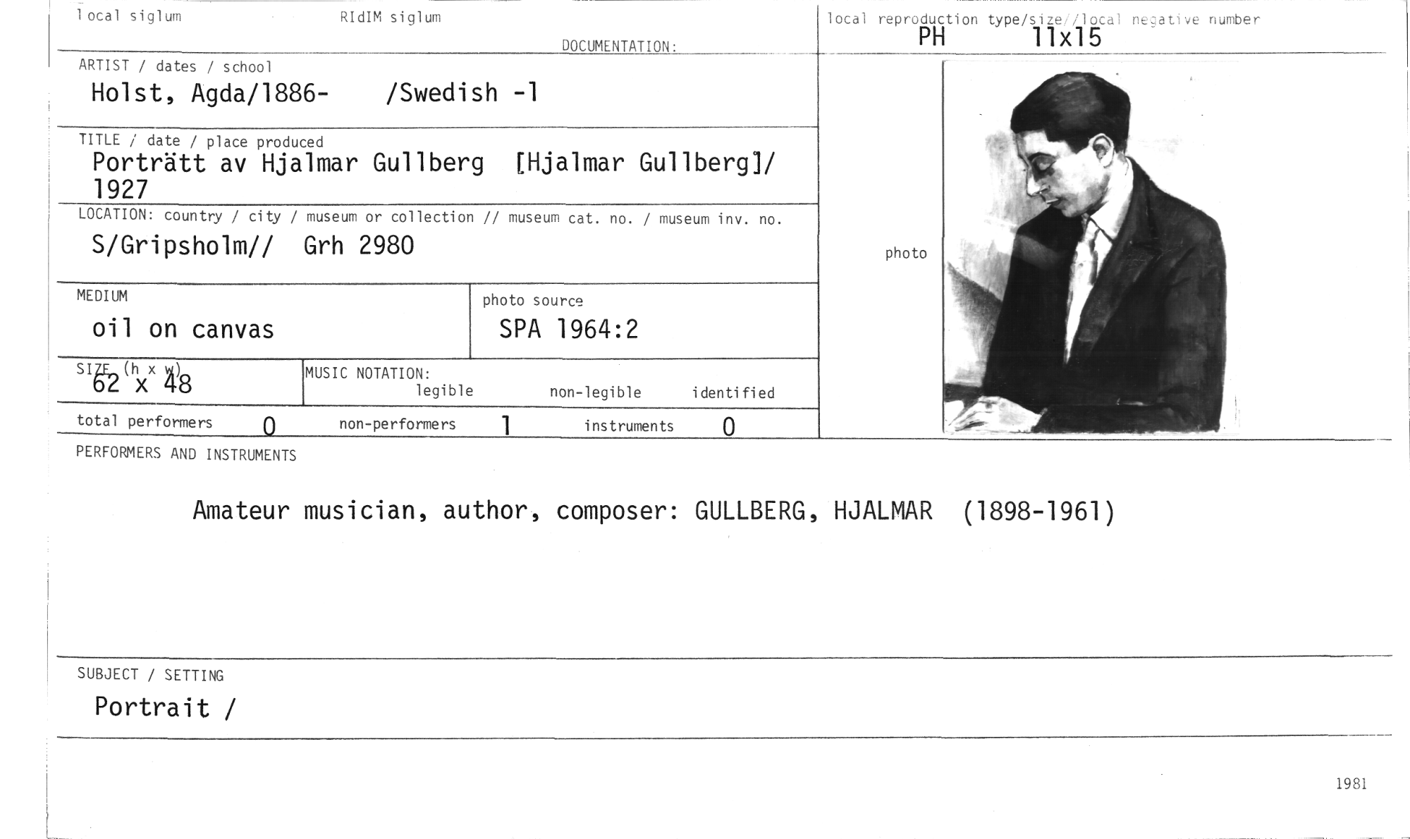 //// PERFORMERS AND INSTRUMENTS //// Amateur musician, author, composer: GULLBERG, HJALMAR (1898-1961) //// SUBJECT / SETTING //// Portrait / //// 1981 //// MEDIUM //// oil on canvas //// photo source //// SPA 1964:2 //// 0 //// instruments //// 1 ocal siglum //// RIdIM siglum //// DOCUMENTATION: //// local reproduction type/sizet/local negative number //// PH 11x15 //// ARTIST / dates / school //// Holst, Agda/1886- /Swedish -1 //// TITLE / date / place produced //// Porträtt av Hjalmar Gullberg [Hjalmar Gullberg]/ 1927 //// LOCATION: country / city / museum or collection // museum cat. no. / museum inv. no. //// S/Gripsholm// Grh 2980 //// photo //// sigE (hx 8 //// MUSIC NOTATION: //// legible //// non-legible identified ////