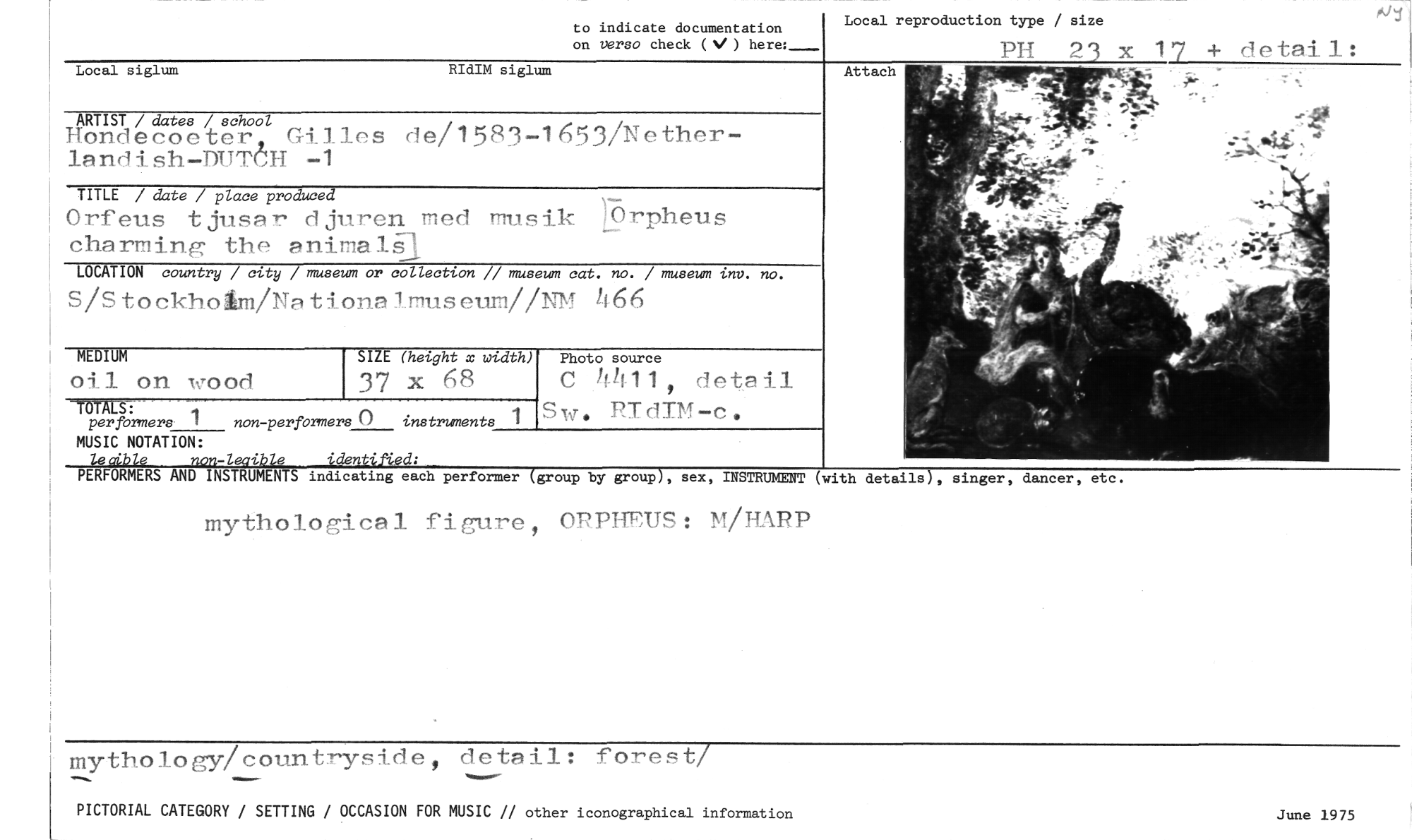 //// MEDIUM //// oil on wood //// SIZE (height x width) //// 37 x 68 //// Photo source //// C 4411, detail Sw. RTdTM-e. //// instruments //// -TOTALS: //// per formers 1 non-perfbilmers () //// MUSIC NOTATION: //// 1 All //// Local siglum //// to indicate documentation //// on verso check (NI ) here:_ //// Local reproduction type / size //// PH 2'3 x 17 + detai //// • //// RIdIM siglum //// ARTIST / dates / school //// Hondeeoeter, Gilles de/1583-1653/Netherlandish-DUTCH -1 //// TITLE / date / place produced //// Orfeus tjusar djuren med musik I:Orpheus charming the animalå3 //// LOCATION country / city / museum or collection // museum cat. no. / museum :my. no. //// S/S t o ekhoim/Na tionalmuseum//NM 1166 //// -Z-•ir e de d: //// PERFORMERS AND INSTRUMENTS indicating each performer group by group , sex, INSTRUMENT (with deta 1s), singer, dancer, et //// mythological figure , ORPHEUS: M/HARP //// mythology/countryside, detail: forest/ //// PICTORIAL CATEGORY / SETTING / OCCASION FOR MUSIC // other iconographical information //// June 1975 ////
