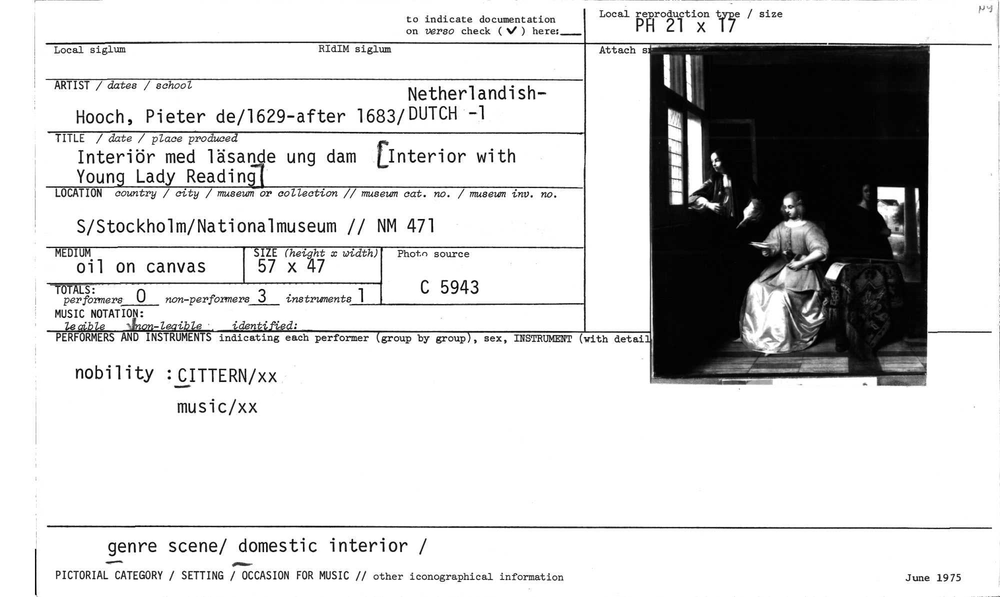 //// June 1975 //// PICTORIAL CATEGORY / SETTING / OCCASION FOR MUSIC // other iconographical information //// MEDIUM //// SIZE (height x width) //// 57 x 47 //// oil on canvas //// to indicate documentation //// on verso check (V ) here: //// Local rPHeproduction type / size //// 21 x 17 //// Attach //// Local siglum //// Netherlandish- //// Hooch, Pieter de/1629-after 1683/DUTCH -1 //// TITLE / date / place produced //// Interiör med läsande ung dam [Interior with //// Young Lady Readinil //// LOCATION country / city / museum or collection // museum cat. no. / museum inv. no. //// S/Stockholm/Nationalmuseum // NM 471 //// perfbrmers non-performers 3 instruments 1 //// ARTIST / dates / school //// MUSIC NOTATION: //// lscible ,Inon-leaible identified: //// PERFORMERS AND INSTRUMENTS indicating each //// performer (group by group), sex, INSTRUMENT (with detail //// nobility :CITTERN/xx //// music/xx //// R dIM siglum //// genre scene/ domestic interior / ////