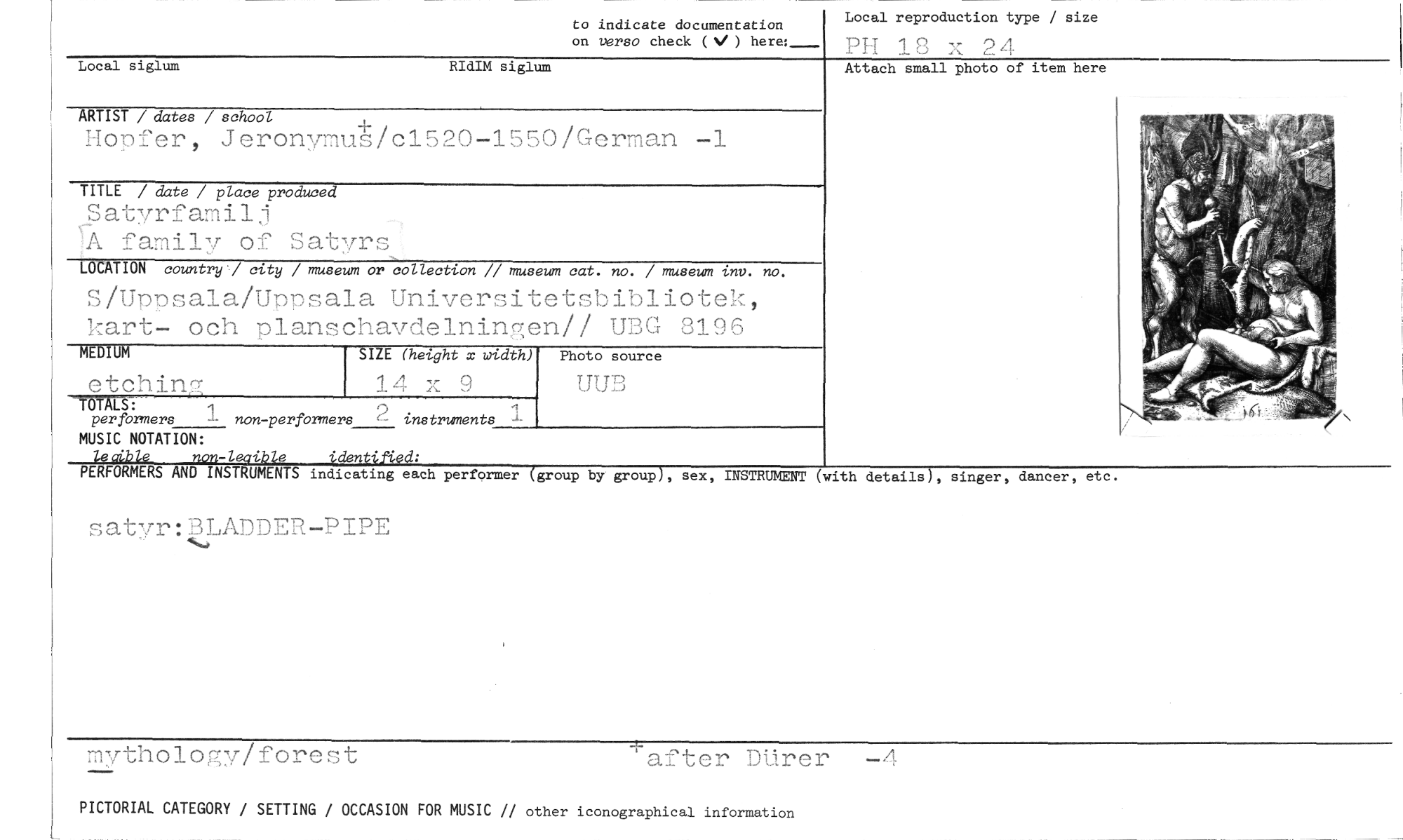 //// to indicate documentation Local reproduction type / size //// on torso check (V ) hem_ PH 18 x 24 //// Attach small photo of item here //// ARTIST / dates / school //// Honfer, Jeronym1Å/c1520-1650/German -1 //// TITLE / date / place produced //// Satvrfamilj //// 'A family of Satvrs //// LOCATION country'/ city / museum Or collection // museum cat. no. / museum inv. no. //// S/Upusala/Uppsala Universitetsbibliotek, kart- och planschavdelningen// UBG 8196 //// MEDIUM SIZE (height x width) Photo source //// 211/22 14 x 9 UUB //// . //// per formers 'D non-performers tnetruments //// MUSIC NOTATION: //// i aible non-leaible identifUd; //// PERFORMERS AND INSTRUMENTS indicating each performer (group by group), sex, //// satyr:ZIADDER-PIPE //// mvthology/forest safter DUrer -4 //// INSTRUMENT (with detailsj, singer, dancer, etc. //// Local siglum RIdIM siglum //// PICTORIAL CATEGORY / SETTING / OCCASION FOR MUSIC // other iconographical information ////