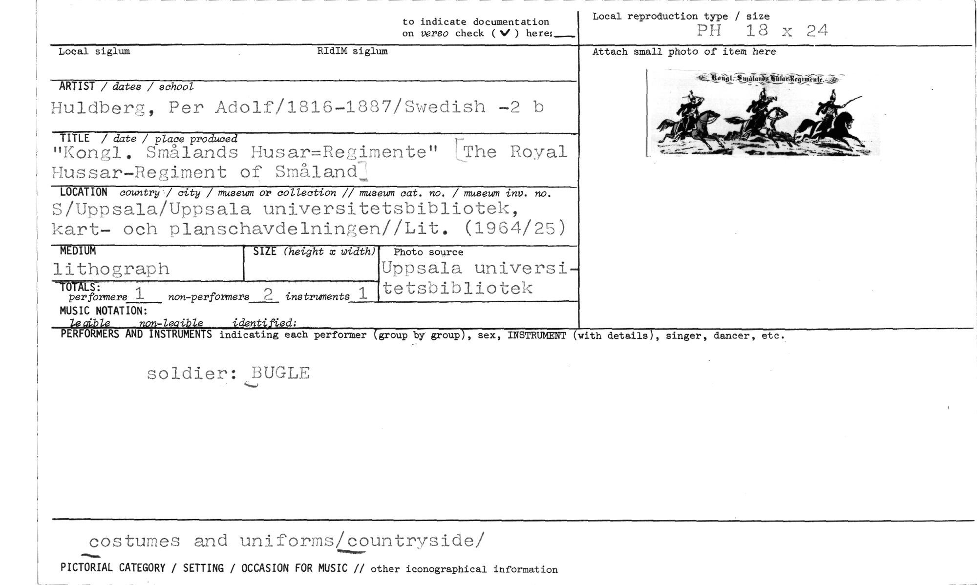//// to indicate documentation Local reproduction type / size //// on verso check (V) here:— PH 18 x 24 //// Local siglum RIdIM siglum //// ARTIST / dates / school //// Huldberg, Per Adolf/1816-1887/Swedish -2 b //// TITLE / date / place produced //// "Kongl. Smålands Husar=Regimente" The Royal Hussar-Regiment of Småland //// LOCATION country / city / museum or collection // museum cat. no. / museum inv. no. //// Attach small photo of item here //// S/Uppsala/Uppsala universitetsbibliotek, kart- och planschavdelningen//Lit. (1964/25) //// MEDIUM SIZE (height x width) //// lithograph //// -TOTALS: //// performere 1 non -perfermere 2 instruments 1 //// MUSIC NOTATION: //// leaible_ non-leaiblg identified: //// PERFORMERS AND INSTRUMENTS indicating each performer [group by group), sex, INSTRUMENT (with details), singer, dancer, etc. //// soldier: BUGLE //// Photo source //// Uppsala universitetsbibliotek //// costumes and uniforms/countryside/ //// PICTORIAL CATEGORY / SETTING / OCCASION FOR MUSIC // other iconographical information ////