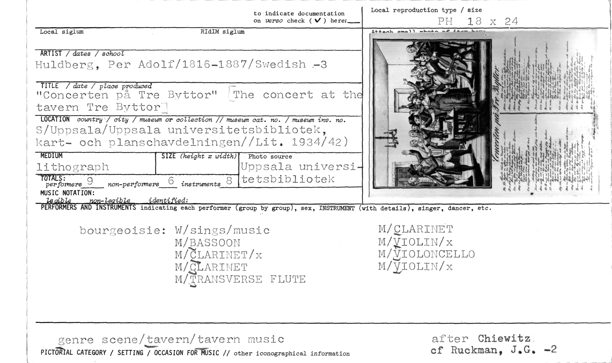 //// to indicate documentation Local reproduction type / size //// on versa check (V) PH 18 //// 24 //// A nr. //// ARTIST / dates / school //// Huldberg, Per Adolf/1816-1887/Swedish //// TITLE / date / place produced //// "Concerten pa Tre Byttor" The concert at the tavern Tre Byttorl //// LOCATION country / city / museum or collection // museum cat. no. / museum inv. no. //// S/Uppsala/Uppsala universitetsbibliotek, hart- och planschavdelningen//Lit. 1934/42) //// SIZE (height x width) //// -TMALS: //// performers 9 non-performers 6 instruments 8 //// MUSIC NOTATION: //// le la. non-leaible identifisd: //// PERFIRMERS AND INSTRUMENTS indicEttingeachperformer (group by group), sex, //// bourgeoisie: W/sings/music //// M/ZASSOON M/2LARINET/x M/LARINET M/ERANSVERSE FLUTE //// Local siglum RIdIM siglum //// MEDIUM //// lithograph //// Photo source //// Uppsala universitetsbibliotek //// INSTRUMENT (with details), singer, dancer, etc. //// M/CLARINET M/ZIOLIN/x MiSIOLONCELLO M/£10LIN/x //// genre scene/tavern/tavern music af ,er Chiewitz //// PICTRIAL CATEGORY / SETTING / OCCASION FOrMSIC // other iconographical information cf Ruckman, J.G. -2 ////