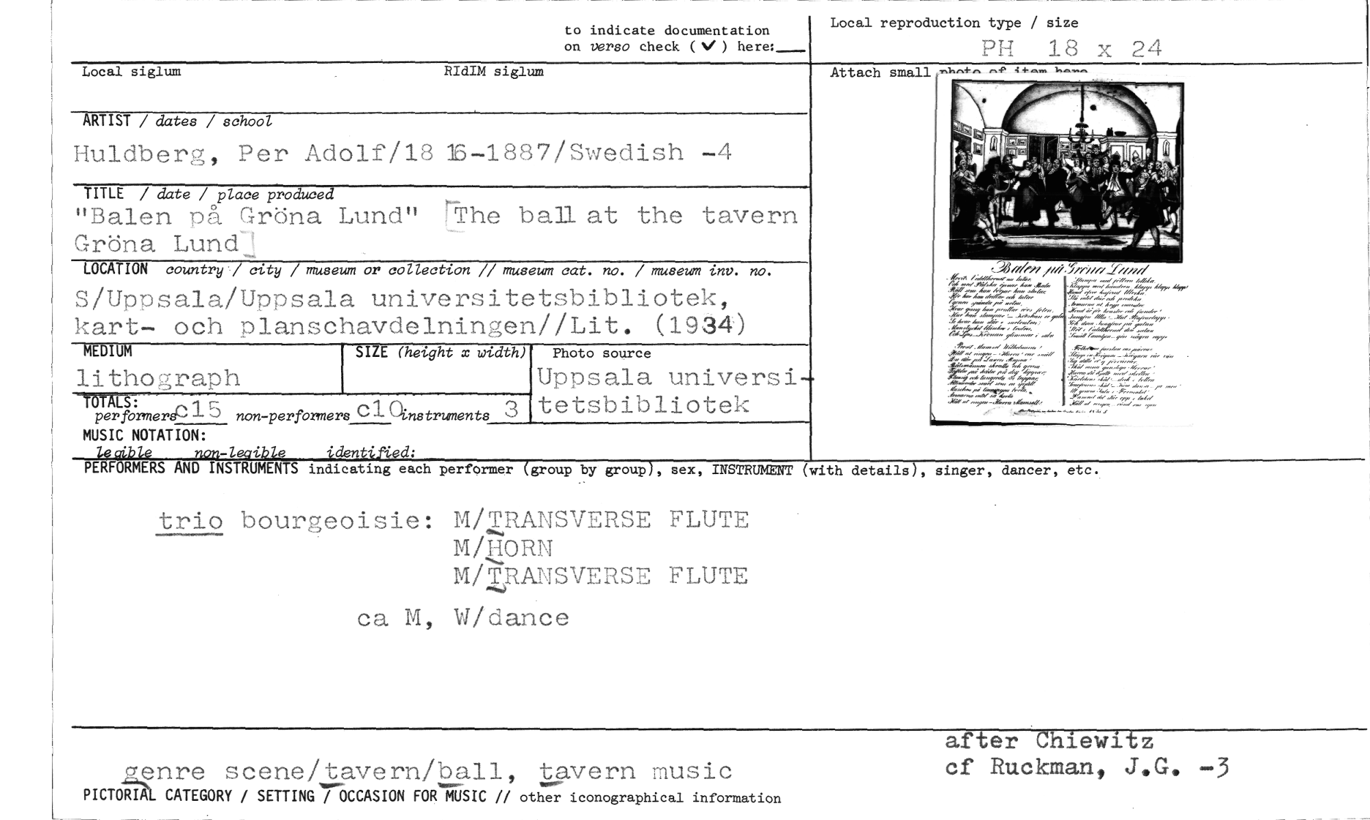 //// to indicate documentation //// on verso check ( ) here:_ //// Local reproduction type / size //// PH 18 x 24 //// Attach small //// ARTIST / dates / school //// Huldberg, Per Adolf/18 16-1887/Swedish -4 //// TITLE / date / place produced //// "Balen på Gröna Lund" The ball at the tavern Gröna Lund //// LOCATION country / city / museum or collection // museum cat. no. / museum tnv. no. //// S/Uppsala/Uppsala universitetsbibliotek, hart- och planschavdelningen//Lit. (1934) //// SIZE (height x width) //// TOTALS: //// per form 5 non-per förmera C.1. Ctistruments 3 //// MUSIC NOTATION: //// leable non-lecible identified; //// PERFORMERS AND INSTRUMENTS indicating each performer (group by group), sex, INSTRUMENT (with details), singer, dancer, etc. //// MEDIUM //// lithograph //// Local siglum //// RIdIM siglum //// Photo source //// Uppsala universi tetsbibliotek //// trio bourgeoisie: M/ZRANSVERSE FLUTE //// M/HORN //// M/DIANSVERSE FLUTE //// ca M, W/dance //// after Chiewitz //// cf Ruckman, J.G. -3 //// Epnre scene/tavern/ball, tavern music //// picroluxt CATEGORY / SETTING / OCCASION FOR MUSIC // other iconographical information ////