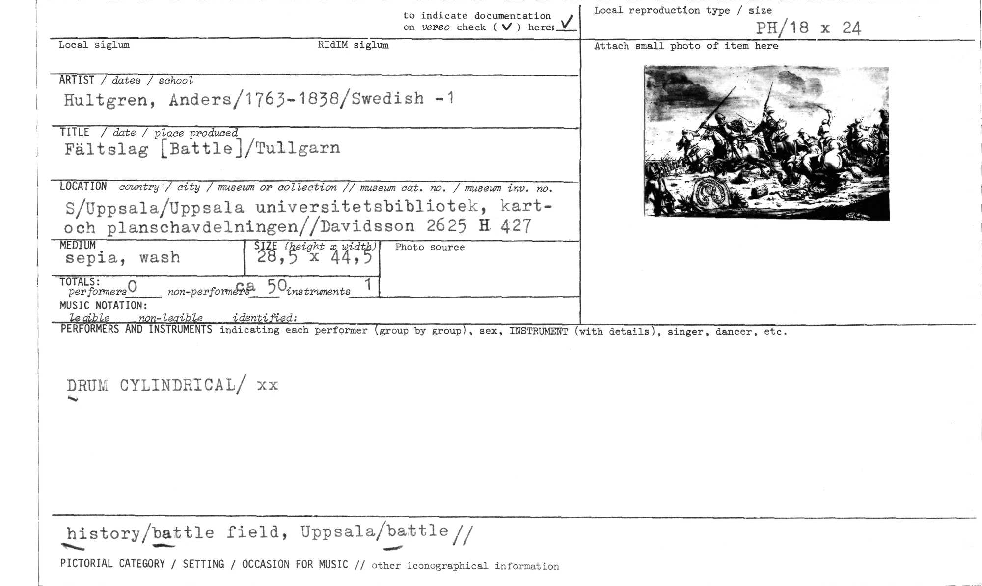 //// Local reproduction type / size //// PH/18 x 24 //// to indicate documentation ,/ on verso check (V ) here: V //// Local siglum RIdIM siglum //// ARTIST / dates / school //// Hultgren, Anders/1765-1838/Swedish -1 //// TITLE / date / place produced //// Fältslag [Battle]/Tullgarn //// LOCATION country / city / museum or collection // museum cat. no. / museum inv. no. //// S/Uppsala/Uppsala universitetsbibliotek, kart-och planschavdelningen//Davidsson 2625 H. 427 //// MEDIUMS rileight x 2,2Jc/tio Photo source //// sepia, wash ail5 x 44,D //// Attach small photo of item here //// nTALS: n //// . //// per formers' non-perfortne9s 50 instruments //// MUSIC NOTATION: //// lecdble nnn-leaible identified: //// PERFORMERS AND INSTRUMENTS indicating each performer (group by group), sex, INSTRUMENT (with details), singer, dancer, etc. //// DRUM CYLINDRICAL/ xx //// history/battle field, Uppsala/battle// //// PICTORIAL CATEGORY / SETTING / OCCASION FOR MUSIC // other iconographical information ////