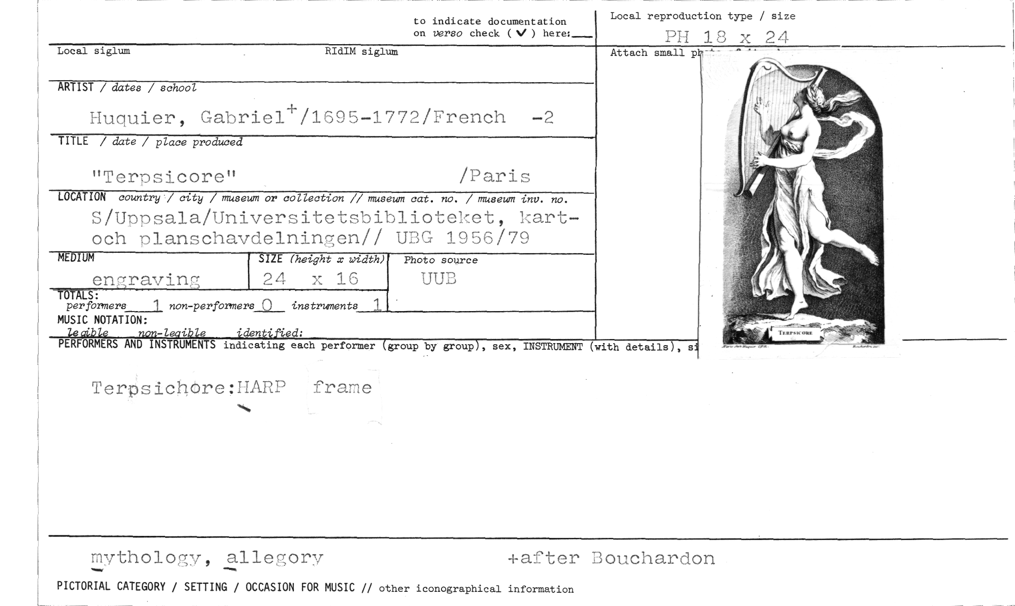 //// Local reproduction type / size //// PH 18 x 24 //// to indicate documentation //// on verso check ( V ) here:- //// Local siglum RIdIM siglum //// ARTIST / dater / school //// Huquier, Gabriel+/1695-1772/French -2 //// TITLE / date / place produced //// "Terpsicore" /Paris //// LOCATION country'/ city / museum or collection // museum cat. no. / museum inv. no. //// 5/Uppsala/Universitetsbiblioteket, kart-och planschavdelningen// UBG 1956/79 //// Attach small p //// MEDIUM //// en gravin; SIZE (height x width) //// 24 x 16 //// Photo source //// UUB //// 1 //// performere___ non-performers_91__ instruments MUSIC NOTATION: //// -/ i • • • d: //// AND performer (group by group), sex, INSTRUMENT (with details), si //// TerpsichOre:HARP frame //// mvtholoav alleaorv 4-arter Bouchardon //// PICTORIAL CATEGORY / SETTING / OCCASION FOR MUSIC // other iconographical information ////