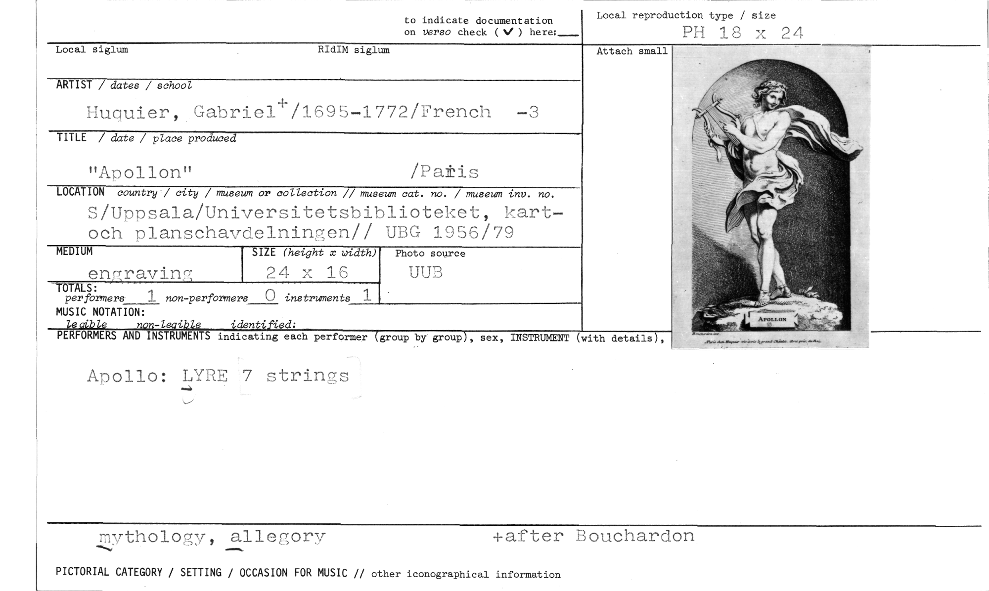 //// to indicate documentation //// on verso check ( ) here:__-- //// Local reproduction type / size //// PH 18 -,- 24 //// Local siglum RIdIM siglum //// ARTIST / dates / school //// Huquier, Gabriel+/1695-1772/French -3 //// TITLE / date / place produced //// "Apollon" /Patis //// LOCATION country / city / museum or collection // museum cat. no. / museum inv. no. //// S/Uppsala/Universitetsbiblioteket, hart-och planschavdelningen// UBG 1956/79 //// MEDIUM SIZE (height x width) Photo source //// engraving 24 x 16 UUB //// 1 OTALS: //// per formers 1 non-perfOrmers L) instruments 1 //// MUSIC NOTATION: //// nnn-leaible identif4ed; //// PERFORMERS AND INSTRUMENTS indicating each performer (group by group), sex, INSTRUMENT //// Attach small //// (with details), //// Apollo: LYRE 7 strings //// mvthology, allegory +after Bouchardon //// PICTORIAL CATEGORY / SETTING / OCCASION FOR MUSIC // other iconographical information ////