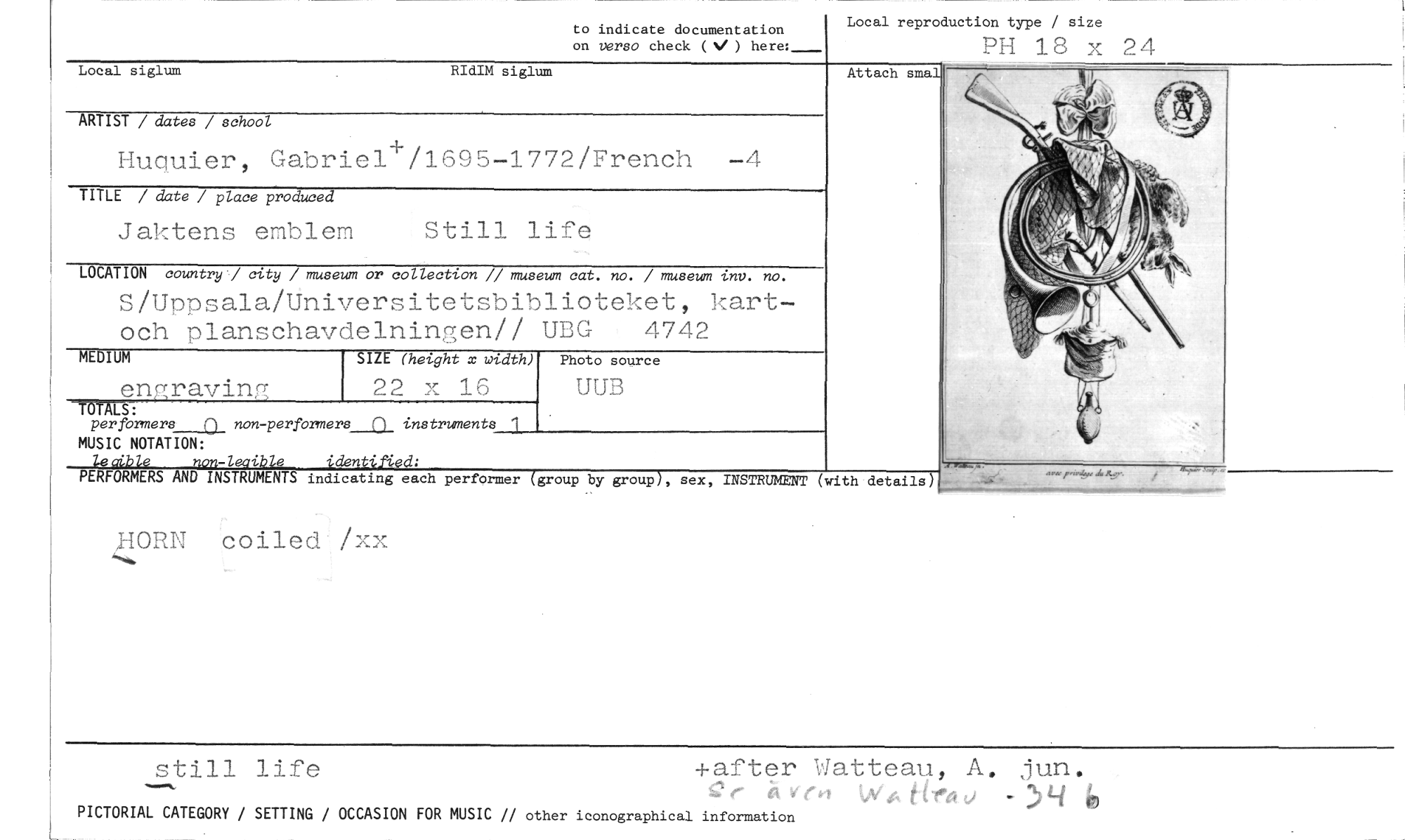 //// to indicate documentation on verso check ( ) //// Local reproduction type / size //// PH 18 x 24 //// Attach smal //// Local siglum RIdIM siglum //// ARTIST / dates / school //// Huquier, Gabriell-/1695-1772/French -4 //// TITLE / date / place produced //// Jaktens emblem Still life //// LOCATION country ./ city / museum or collection // museum cat. no. / museum inv. no. //// S/Uppsala/Universitetsbiblioteket, kart-och planschavdelningen// UBG 4742 //// MEDIUM SIZE (height x width) Photo source //// engraving 22 x 16 UUB //// TÖTALS: //// per formers C) non-perfbrmers C) instruments 1 //// MUSIC NOTATION: //// leaible non-/egible identified: //// PERFORMERS AND INSTRUMENTS indicating each performer (group by group), sex, //// INSTRUMENT (with details) //// N-ÖRN coiled /xx //// still life +after Watteau, A. jun. //// vro kki,6 Kela - 314 //// PICTORIAL CATEGORY / SETTING / OCCASION FOR MUSIC // other iconographical information ////