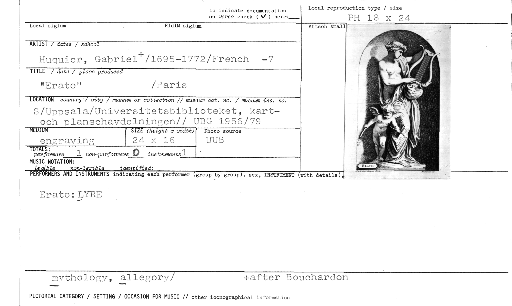 //// to indicate documentation on verso check (h/ ) here: //// Local reproduction type / size //// PH 18 x 24 //// Local siglum RIdIM siglum //// ARTIST / dates / school //// Huquier, Gabriel+/1695-1772/French -7 //// T TLE / date / place produced //// "Erato" /Paris //// LOCATION country / city / museum or collection // museum cat. no. / museum inv. no. //// Erato:LYRE //// S/Uppsala/Universitetsbiblioteket, kart--och planschavdelningen// UBG 1956/79 //// MEDIUM SIZE (height x width) Photo source //// engraving 24 x 16 UUB //// Attach small' //// -77M77-' //// perförmers 1 non-perförmers instrzinents1 //// MUSIC NOTATION: //// identified: //// PERFORMERS AND INSTRUMENTS indicating each performer (group by group), sex, INSTRUMENT (with details), //// L //// mythology, allegory/ 4-after i3ouchardon //// PICTORIAL CATEGORY / SETTING / OCCASION FOR MUSIC // other iconographical information ////