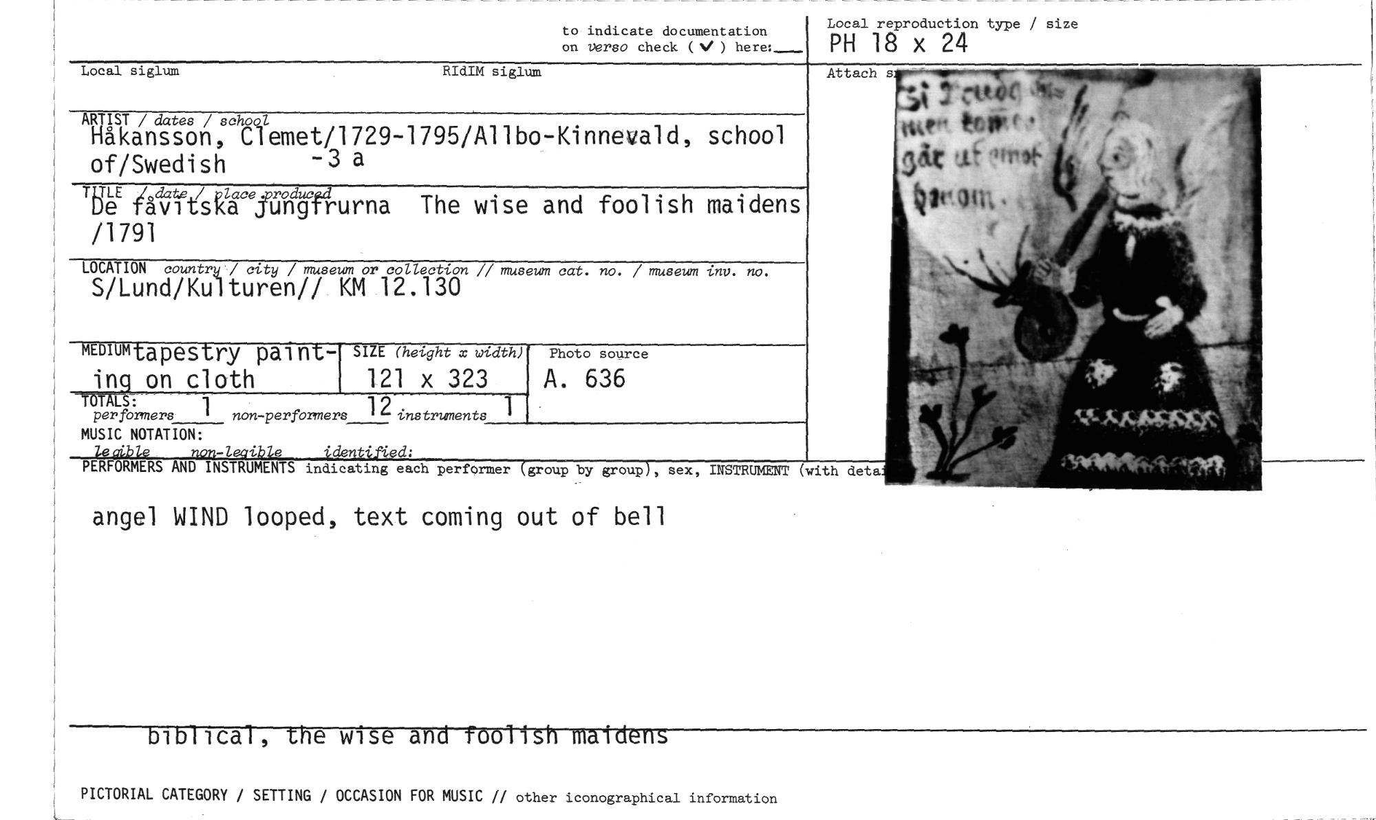 //// angel WIND looped, text coming out of bell //// bibilcaT, the wise and foollsh maidums //// to indicate documentation Local reproduction type / size //// on verso check (NI) here:, PH 18 x 24 //// Local siglum RIdIM siglum //// ARTIST / dates / schoal //// Håkansson, Clemet/1729-1795/Allbo-Kinnevald, school of/Swedish -3 a //// TLTLE 4clate / olace xroduced //// De tavitska jungtrurna The wise and foolish maidens /1791 //// LOCATIONS/Lund/Kult country / uitren// cy / nuseum KM 12 or collectio30n // museum cat. no. / museum luv. no. //// .1 //// MEDIUM tapestry pal nt- //// ing_ on cloth //// TorALs- //// per formers 1 non-perfomners 1 2 instruments //// o. //// MUSIC NOTATION: //// ledb/e non-legible identified: //// Photo source //// A. 636 //// SIZE (height x width) //// 121 x 323 //// PERFORMERS AND INSTRUMENTS indicating each performer (group by group), sex, INSTRUMENT (with deta //// PICTORIAL CATEGORY / SETTING //// / OCCASION FOR //// MUSIC // other iconographical information ////