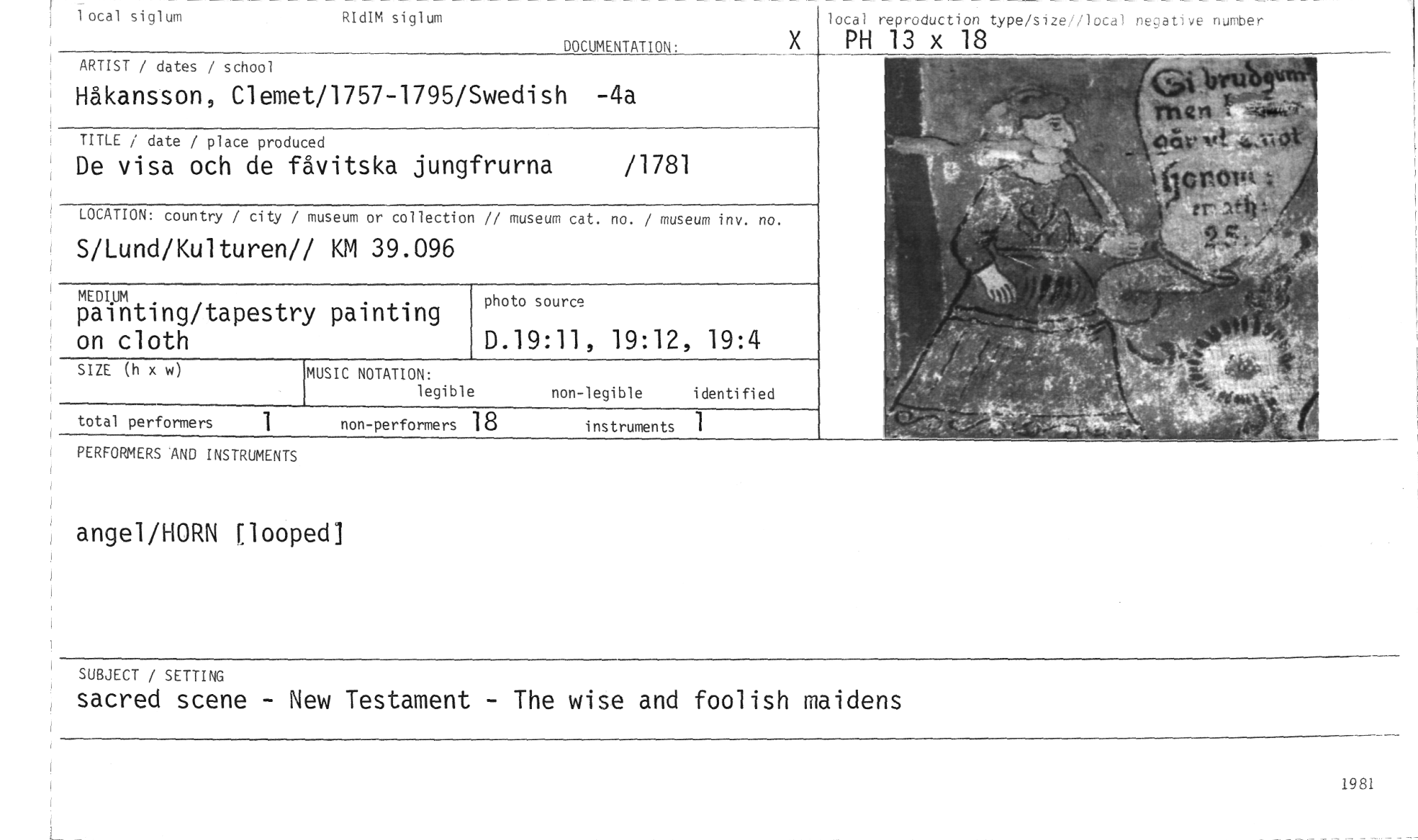 //// angel/HORN (looped] //// SUBJECT / SETTING //// sacred scene - New Testament - The wise and foolish maidens //// photo source //// D.19:11, 19:12, 19:4 //// MEDIUM //// painting/tapestry painting on cloth //// iocal siglum //// RIdIM siglum //// DOCUMENTATION• //// local reproduction type/size//local negative number //// PH 13 x 18 //// ARTIST / dates / school //// Håkansson, Clemet/1757-1795/Swedish -4a //// TITLE / date / place produced //// De visa och de fåvitska jungfrurna /1781 //// LOCATION: country / city / museum or collection // museum cat. no. / museum inv. no. //// S/Lund/Kulturen// KM 39.096 //// SIZE (h x w) //// MUSIC NOTATION: //// legible //// non-legible identified //// total performers 1 non-performers 18 instruments //// PERFORMERS 'AND INSTRUMENTS //// 1981 ////