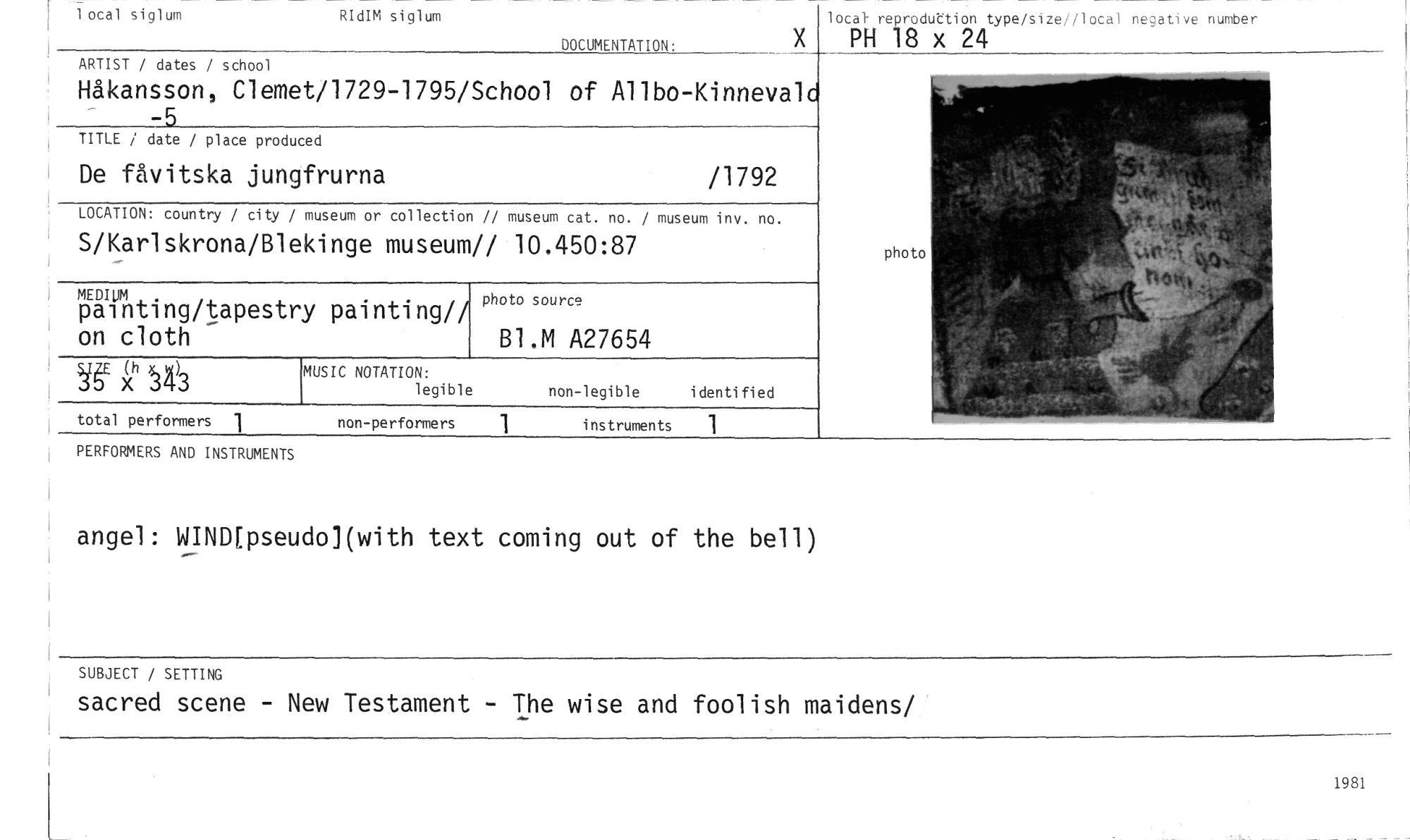 //// PERFORMERS AND INSTRUMENTS //// angel: WIND[pseudo](with text coming out of the bell) //// SUBJECT / SETTING //// sacred scene - New Testament - The wise and foolish maidens/ //// 1 ocal siglum //// RIdIM siglum //// DOCUMENTATION: //// loca1 reproduttion type/size local nezative nurober //// X PH 18 x 24 //// ARTIST / dates / school //// Håkansson, Clemet/1729-1795/School of Allbo-Kinnevalc //// -5 //// TITLE / date / place produced //// De fåvitska jungfrurna /1792 //// LOCATION: country / city / museum or collection // museum cat. no. / museum inv. //// S/Karlskrona/Blekinge museum// 10.450:87 //// I MEDIUM //// painting/tapestry painting// on cloth //// photo //// bh)3 //// total performers //// MUSIC NOTATION: //// legible //// photo source //// 81.M A27654 //// non-legible identified //// 1981 ////