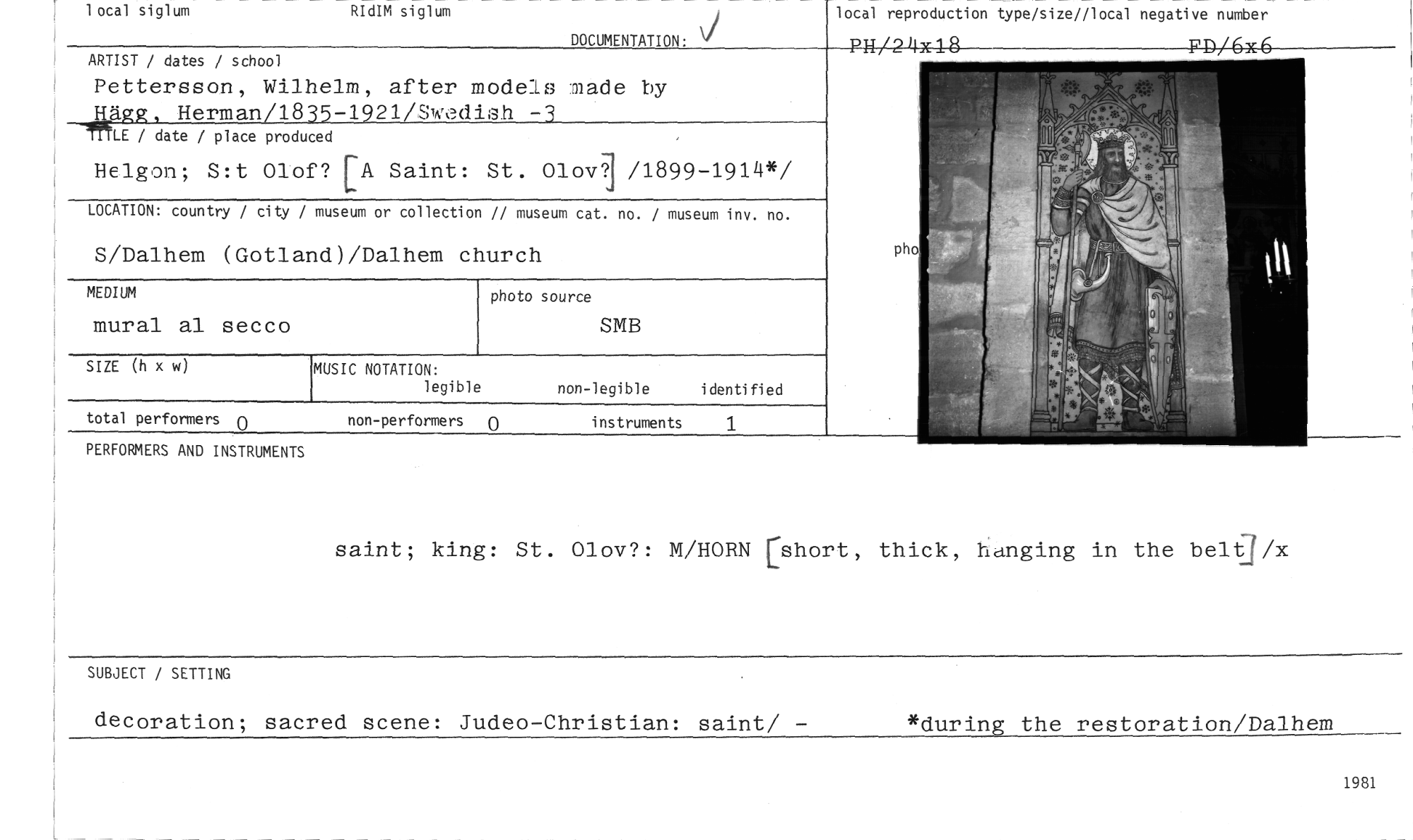 //// local siglum RIdIM siglum //// local reproduction type/size//local negative number //// PH/24x18 FD/6x6 //// DOCUMENTATION: //// ARTIST / dates / school //// Pettersson, Wilhelm, after modets made by gg Herman/1835-1921/Swedish -3 //// LE / date / place produced //// Helgon; S:t Olof? [A Saint: St. Olov' /1899-1914*/ //// LOCATION: country / city / museum or collection // museum cat. no. / museum inv. no. //// S/Dalhem (Gotland)/Dalhem church //// photo source //// mural al secco //// SIZE (h x w) //// non-legible identified //// total performers O non-performers 0 instruments 1 //// PERFORMERS AND INSTRUMENTS //// MEDIUM //// MUSIC NOTATION: //// legible //// SMB //// ph //// saint; king: St. Olov?: M/HORN Cshort, thick, hanging in the bele /x //// SUBJECT / SETTING //// decoration; sacred scene: Judeo-Christian: saint/ - *during the restoration/Dalhem //// 1981 ////
