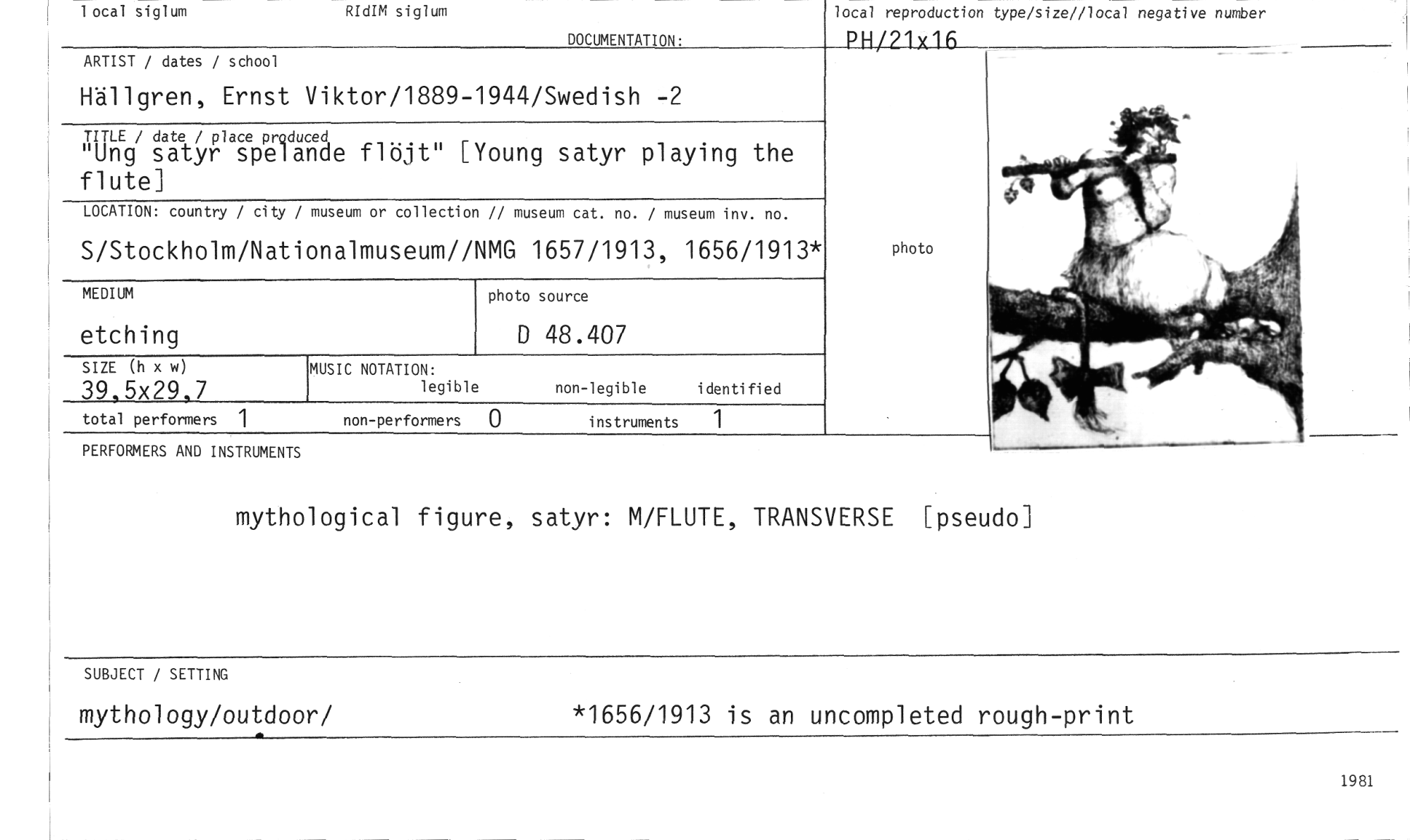 //// 1 ocal siglum RIdIM siglum //// ARTIST / dates / school //// local reproduction //// RH/21x16 //// ype/size//local negative number //// DOCUMENTATION: //// Hällgren, Ernst Viktor/1889-1944/Swedish -2 //// TITLE / date / place produced //// "Ung satyr spelande flöjt" [Young satyr playing the flute] //// LOCATION: country / city / museum or collection // museum cat. no. / museum inv. no. //// S/Stockholm/Nationalmuseum//NMG 1657/1913, 1656/1913* //// photo source //// etching //// SIZE (h x w) //// 39,5x29.7 //// total performers 1 non-performers 0 instruments 1 //// PERFORMERS AND INSTRUMENTS //// MEDIUM //// MUSIC NOTATION: //// legible //// D 48.407 //// non-legible identified //// photo //// mythological figure, satyr: M/FLUTE, TRANSVERSE [pseudo] //// SUBJECT / SETTING *1656/1913 is an uncompleted rough-print //// mythology/outdoor/ //// 1981 ////