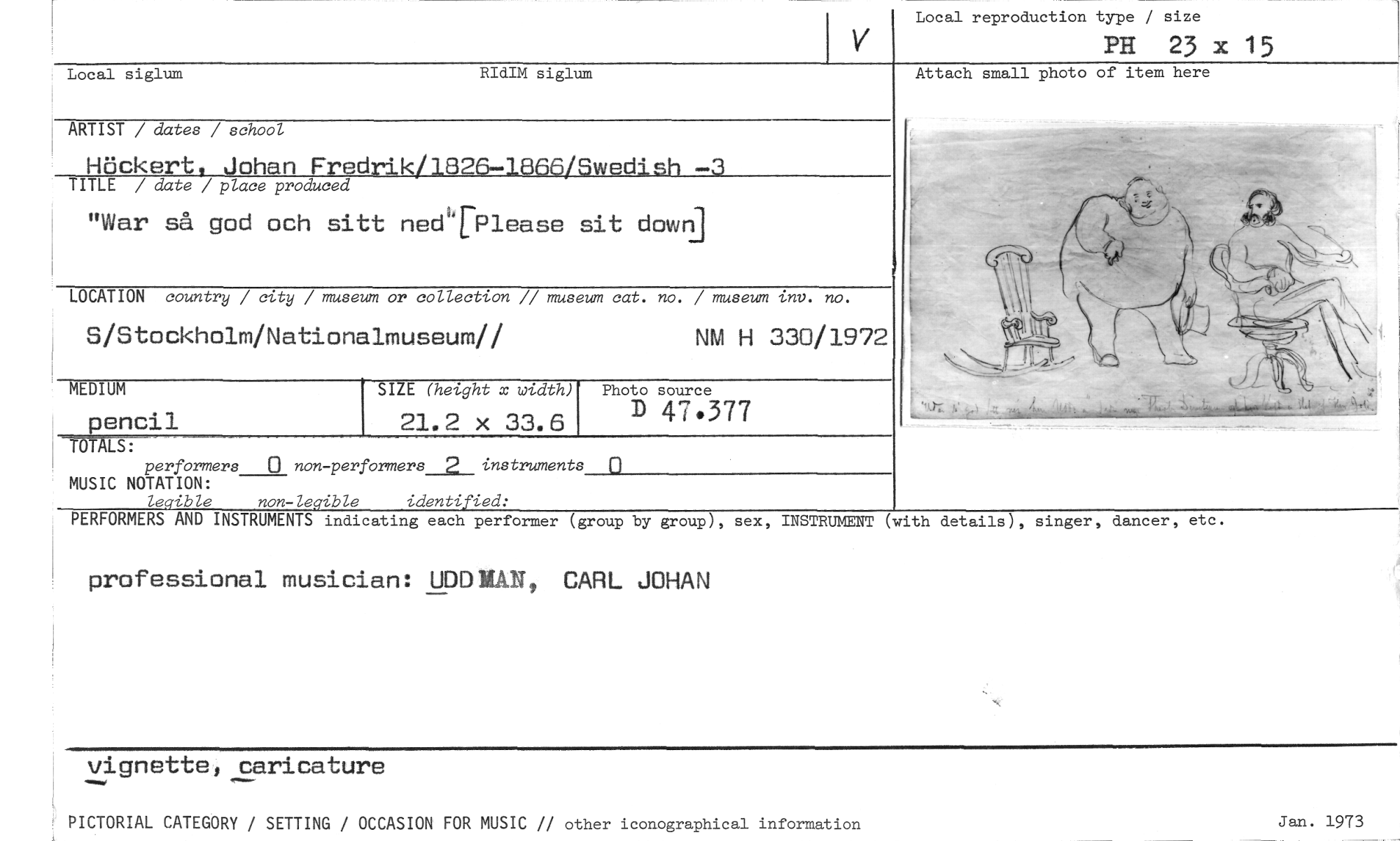 //// Local reproduction type / size //// PH 23 x 15 //// Attach small photo of item here //// 2 //// Local siglum RIdIM siglum //// ARTIST / dates / school //// Höckert, Johan Fredrik/1826-1666/Swedish -3 //// TITLE / date / place produced //// "War så god och sitt nedTP1ease sit down //// LOCATION country / city / museum or collection // museum cat. no. / museum inv. no. //// S/Stockholm/Nationalmuseum// NM H 330/1972 //// SIZE (height x width) //// 21.2 x 33.6 //// MEDIUM //// penci1 //// Photo source //// D 47.377 //// TOT LS: //// performers 0 non-performers_a_ instruments 0 //// MUSIC NOTATION: //// legible non-legible identified: //// PERFORMERS AND INSTRUMENTS indicating each performer (group by group), sex, INSTRUMENT (with details), singer, dancer, etc. //// professional musician: UDDMAN CARL JOHAN //// vignette caricature Jan. 1973 //// PICTORIAL CATEGORY / SETTING / OCCASION FOR MUSIC // other iconographical information ////