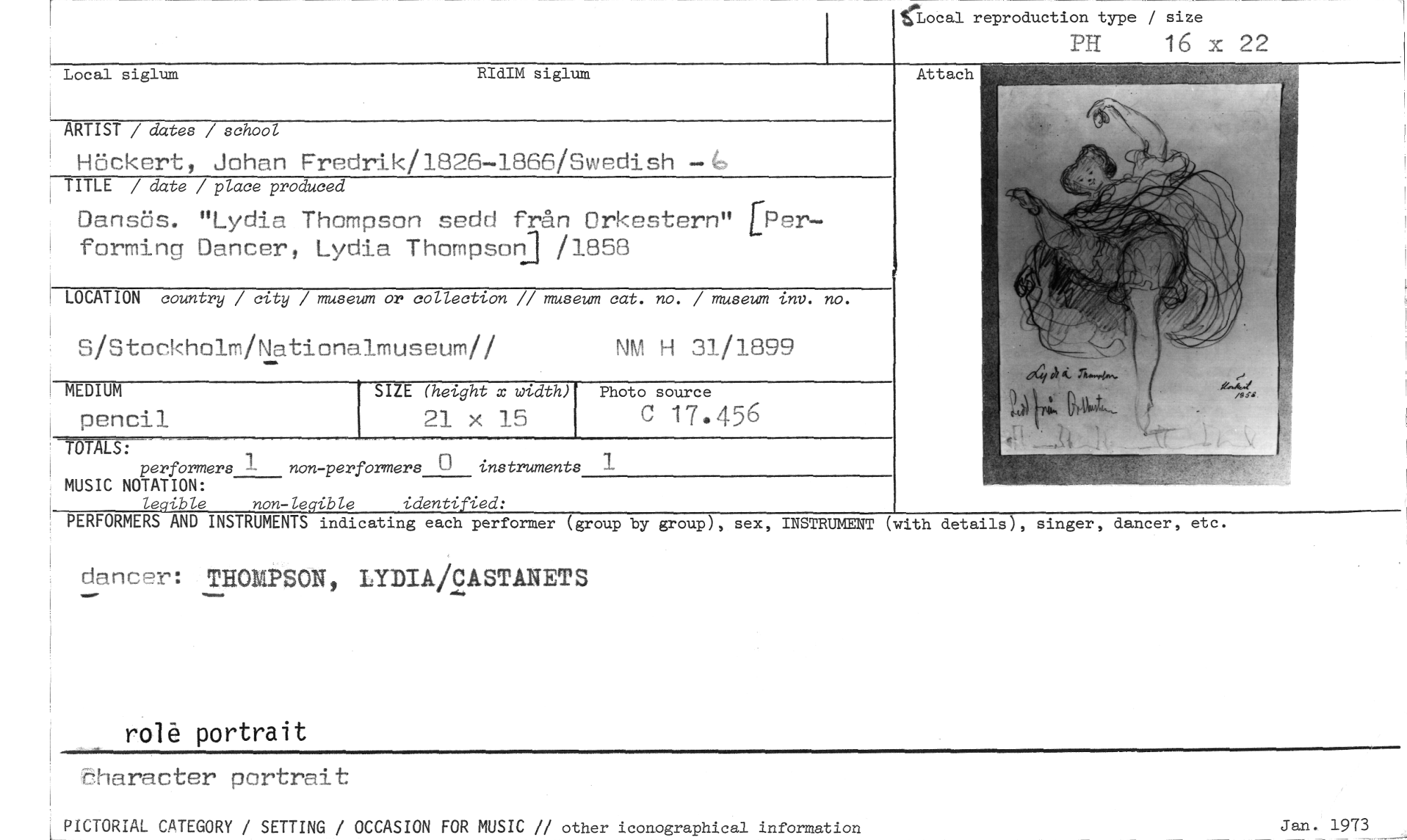 //// <Local reproduction type / size //// PH 16 x 22 //// Local siglum RIdIM siglum //// ARTIST / dates / school //// Höckert, Johan Fredrik/1826-1866/Swedish —4> //// TITLE / date / place produced //// Dansös. "Lydia Thompson sedd från Orkestern" EP,,rforming Dancer, Lydia Thompson] /1858 //// LOCATION country / city / museum or collection // museum cat. no. / museum inv. no. //// Attach //// S/Stockholm/Nationalmuseum// //// MEDIUM //// pencil //// SIZE (height x width) //// 21 x 15 //// NM H 31/1899 //// Photo source //// C 17.456 //// TOT'LS: //// perförmers 1 non -perförmers instruments //// MUSIC NOTATION: //// le ible non-le•ible identi ied: //// PERFORMERS AND INSTRUMENTS indicating each performer (group by //// group), sex, INSTRUMENT (with details), singer, dancer, et //// 1 //// dancer: THOMPSON, LYDIA/CASTANETS //// rote portrait //// Eheracter portrait //// LPICTORIAL CATEGORY / SETTING / OCCASION FOR MUSIC // other iconographical information //// Jan. 1973 ////