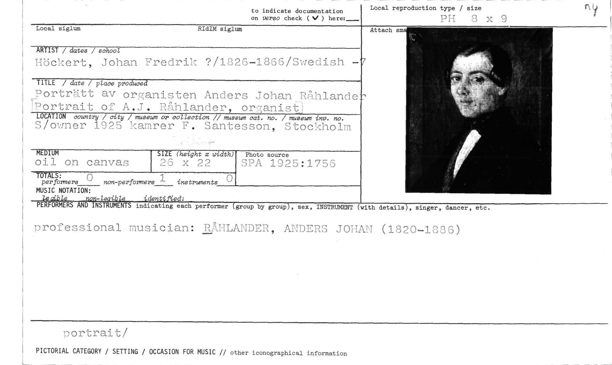 //// Local reproduction type / size //// PH 8 x //// to indicate documentation //// on verso check (V ) here:_ //// Local siglum RIdIM siglum //// ARTIST / dater / school //// Höckert, Johan Fredrik ?/1826-1866/Swedish - //// TITLE / date / place produced //// Porträtt av organisten Anders Johan Råhlande rPortrait of A.J. Råhlander, organist,' //// LOCATION country / city / museum or collection // museum cat. no. / museum inv. no. //// S/owner 1925 kaMrer F. Santesson, Stockholm //// MEDIUM //// oul on canvas //// =Mr— n 1 • //// per formers '"*" non-performers instruments //// MUSIC NOTATION: //// Zeaible nou-leaible identified: //// PERFORMERS AND INSTRUMENTS indicating each performer (group by group), sex, INSTRUMENT (with details), singer, dancer, etc. //// professional musician: RÅHLANDER, ANDERS JOHAN (1820-1886) //// oortrait/ //// PICTORIAL CATEGORV / SETTING / OCCASION FOR MUSIC // other iconographical information //// SIZE (height x width) //// 26 x 22 //// Photo source //// SPA 1925:1756 ////