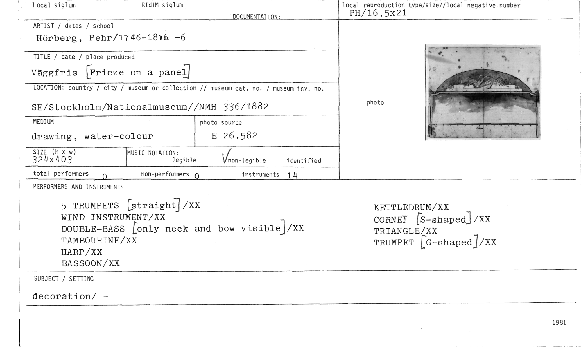 //// 1 ocal siglum RIdIM siglum //// DOCUMENTATION: //// local reproduction type/size//local negative number PH/16,53[21 //// ARTIST / dates / school //// Hörberg, Pehr/1746-181h —6 //// T TLE / date / place produced //// Väggfris [Frieze on a panel //// LOCATION: country / city / museum or collection // museum cat. no. / museum inv. no. //// SE/Stockholm/Nationalmuseum//NMH 336/1882 //// MEDIUM //// drawing, water—colour //// photo source //// E 26.582 //// photo //// //// SIZE (h x w) //// 324X403 //// MUSIC NOTATION: //// legible non-legible identified //// total performers 0 non-performers 0 instruments 14 //// PERFORMERS AND INSTRUMENTS KETTLEDRUM/XX //// 5 TRUMPETS [straighg/XX CORNET (å-shaped]/XX TRIANGLE/XX //// WIND INSTRUMENT/XX TRUMPET [G-shaped]/XX //// DOUBLE-BASS Lonly neck and bow yisiblei/XX TAMBOURINE/XX //// HARP/XX //// BASSOON/XX //// SUBJECT / SETTING //// decoration/ — //// 1981 ////