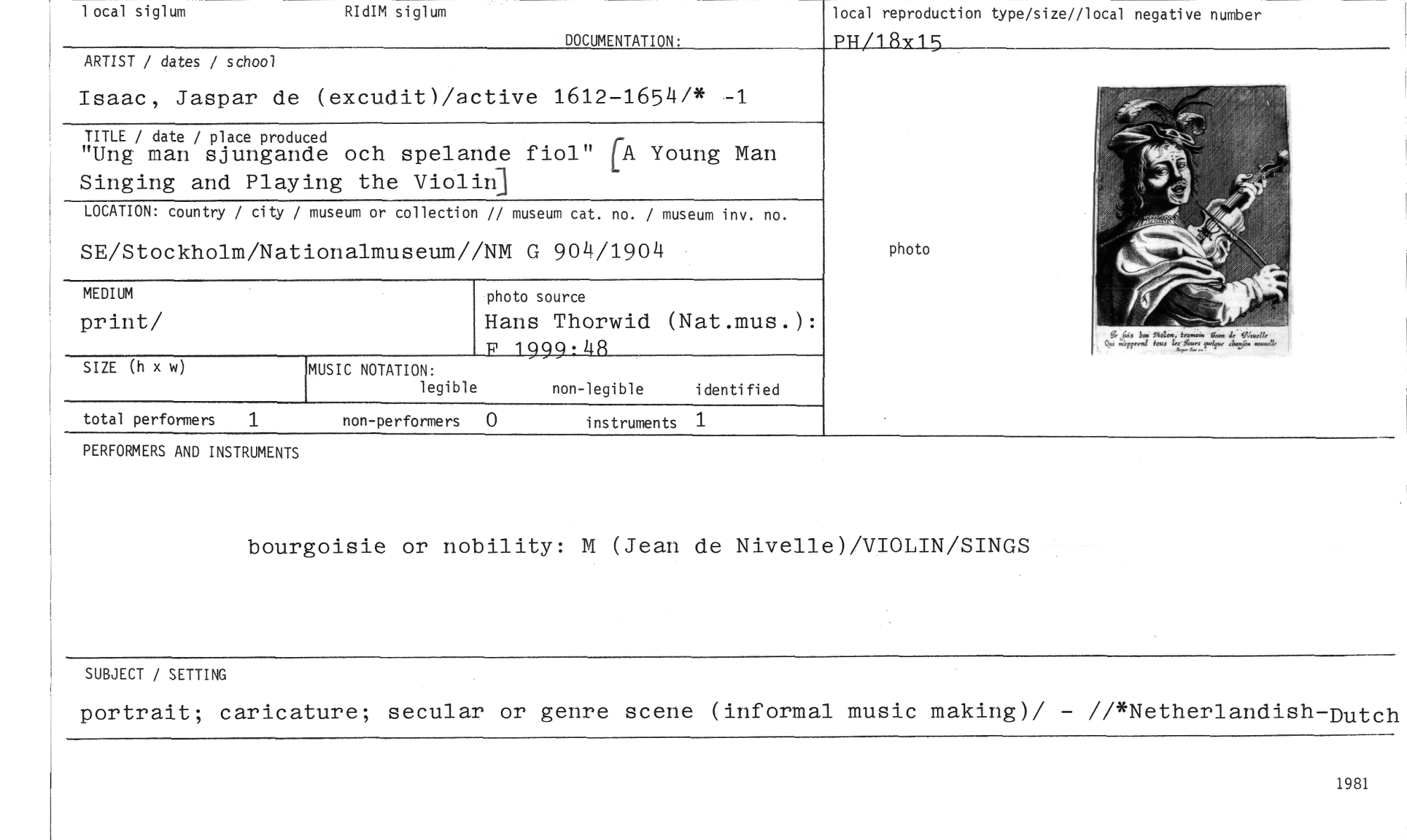 //// 1 ocal siglum RIdIM siglum //// DOCUMENTATION. //// ARTIST / dates / school //// 1981 //// MUSIC NOTATION: //// legible //// non-legible identified //// photo //// total performers 1 //// non-performers 0 instruments 1 //// Isaac, Jaspar de (excudit)/active 1612-1654/* —1 //// TITLE / date / place produced //// "Ung man sjungande och spelande fiol" CA Young Man Singing and Playing the Violin] //// LOCATION: country / city / museum or collection // museum cat. no. / museum inv. no. //// SE/Stockholm/Nationalmuseum//NM G 904/1904 //// photo source //// Hans Thorwid (Nat.mus.): //// P 1999:48 //// MEDIUM //// print/ //// SIZE (h x w) //// PERFORMERS AND INSTRUMENTS //// bourgoisie or nobility: M (Jean de Nivelle)/VIOLIN/SINGS //// SUBJECT / SETTING //// portrait; caricature; secular or genre scene (informal music making)/ — //*Netherlandish —Dutch //// local reproduction type/size//local negative number //// PH/1 Wx1 5 ////