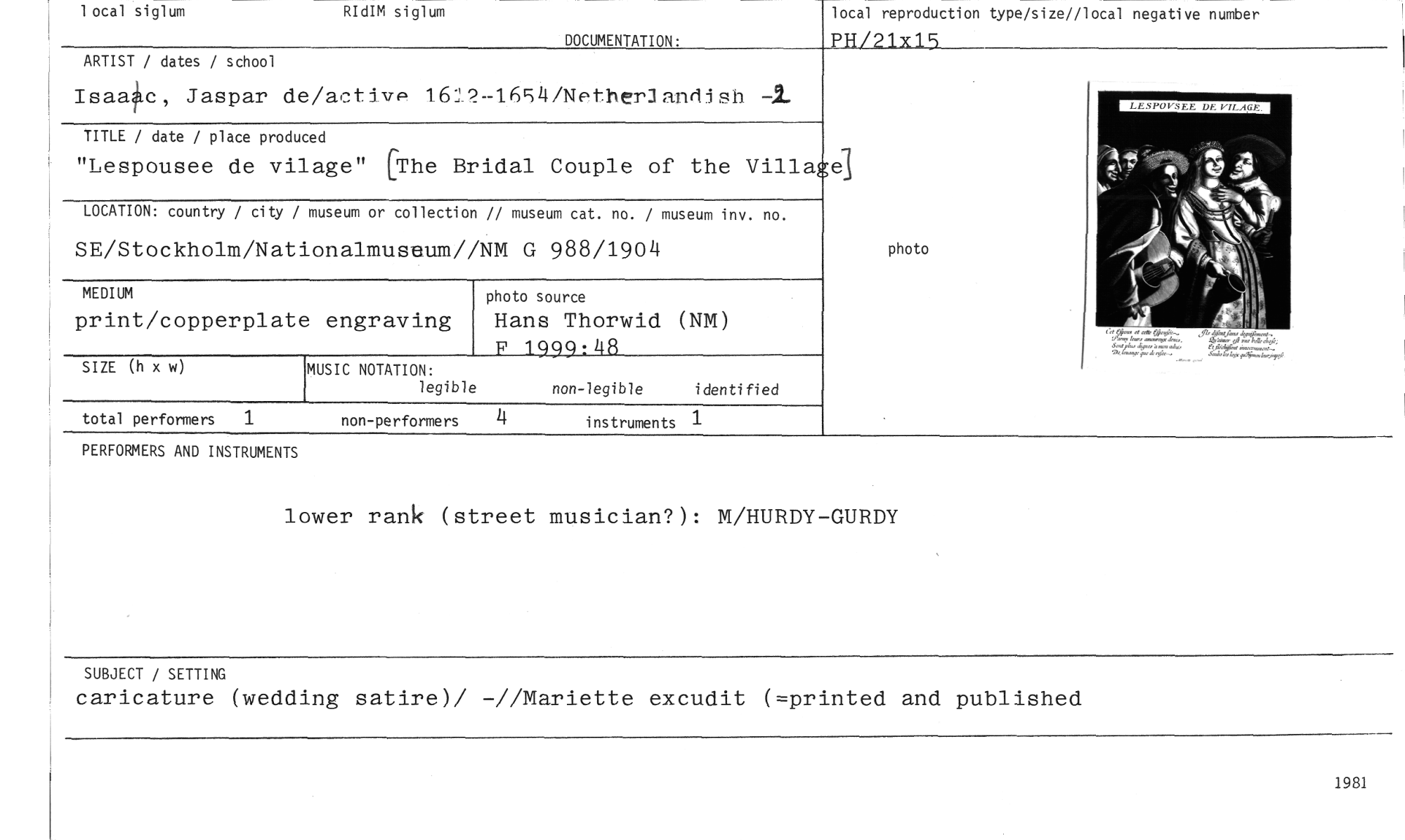 //// 1 ocal siglum RIdIM siglum //// ARTIST / dates / school //// local reproduction type/size//local negative number //// PH/21x15 //// DOCUMENTATION. //// Isa+, Jaspar de/activp 1612-1654/Netherlandish //// TITLE / date / place produced //// "Lespousee de vilage" [The Bridal Couple of the Village //// LOCATION: country / city / museum or collection // museum cat. no. / museum inv. no. //// SE/Stockholm/Nationalmuseum//NM G 988/1904 //// photo source //// Hans Thorwid (NM) //// F 1999:48 //// SIZE (h x w) //// non-legible identified //// MEDIUM //// print/copperplate engraving //// MUSIC NOTATION: //// legible //// photo //// //// total performers 1 non-performers instruments //// PERFORMERS AND INSTRUMENTS //// lower rank (street musician?): M/HURDY—GURDY //// SUBJECT / SETTING //// caricature (wedding satire)/ —//Mariette excudit (=printed and published //// 1981 ////
