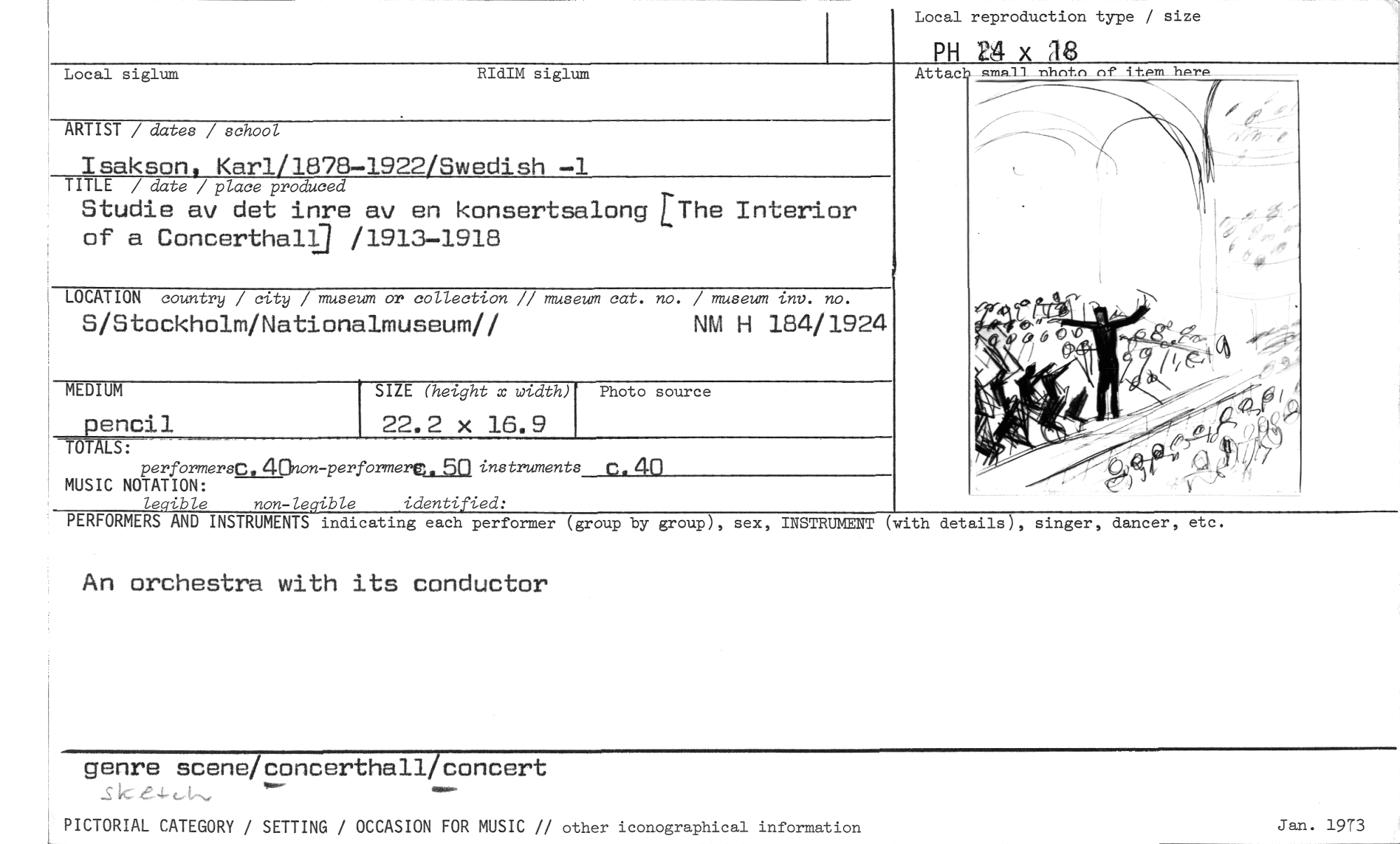 //// genre scene/concerthall/concert ,»- //// PICTORIAL CATEGORY / SETTING / OCCASION FOR MUSIC // other iconographical information //// Jan. 1913 //// Local siglum RIdIM siglum //// Attac smprIl nhntn nf item_hPrp //// PH 24 x 38 //// Local reproduction type / size //// ARTIST / dates / school //// Isakson, Karl/1878-1922/Swedish -1 //// TITLE / date / place produced //// Studie av det inre av en konsertsalong EThe Interior of a Concerthallj /1913-1918 //// LOCATION country / city / museum or collection // museum cat. no. / museum inv. no. //// S/Stockholm/Nationalmuseum// NM H 184/1924 //// encil //// TOT //// performersC. 40non-performere. 5n instruments c. 40 MUSIC NOTATION: Le ible non-le ible identi ied: //// MEDIUM //// SIZE (height x width) //// 22.2 x 16.9 //// Photo source //// -09 //// PERFORMERS AND INSTRUMENTS indicating each performer (group by group), sex, INSTRUMENT (with details), singer, dancer, etc. //// An orchestra with its conductor ////