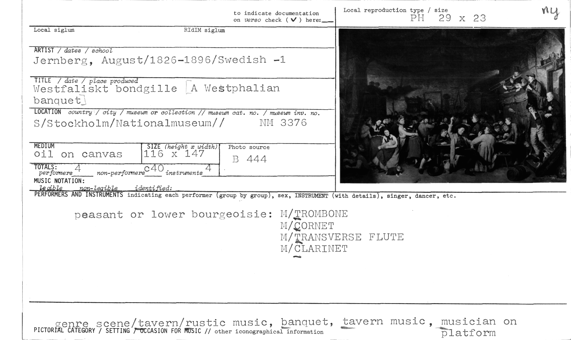 //// genre scene/tavern/rustic music, banquet, tavern music, musician on //// PICTORfAL CATEGORY / SETTING reXCASION FOR MUSIC // other iconographicanlformation lnatform //// Photo source //// B 444 //// SIZE (hetght x wzdth) //// 116 x 147 //// to indicate documentation //// on verso check ( V ) here: __-- //// Local siglum RIdIM siglum //// ARTIST / dates / school //// Jernberg, August/1826-1896/Swedish -1 //// TITLE / date / place produced //// Westfaliskt bondgille Wettphalian //// banquee //// LOCATION country / city / museum or collection // museum cat. no. / museum tnv. no. //// S/Stockholm/Nationalmuseum// NM 3376 //// group by group , sex, INSTRUMENT (with details), singer, dancer, etc. //// peasant or lower bourgeoisie: M/IROMBONE //// M/QORNET M/IRANSVERSE FLUTE M/CLARINET //// TOTALS if-- //// per formers 4 non-performer2574()instruments //// MUSIC NOTATION: //// e 'den //// P ORMERS AND INSTRUMENT indicating each performer //// Local reproduction type / size //// PH 29 x 23 //// MEDIUM //// Oil on canvas ////