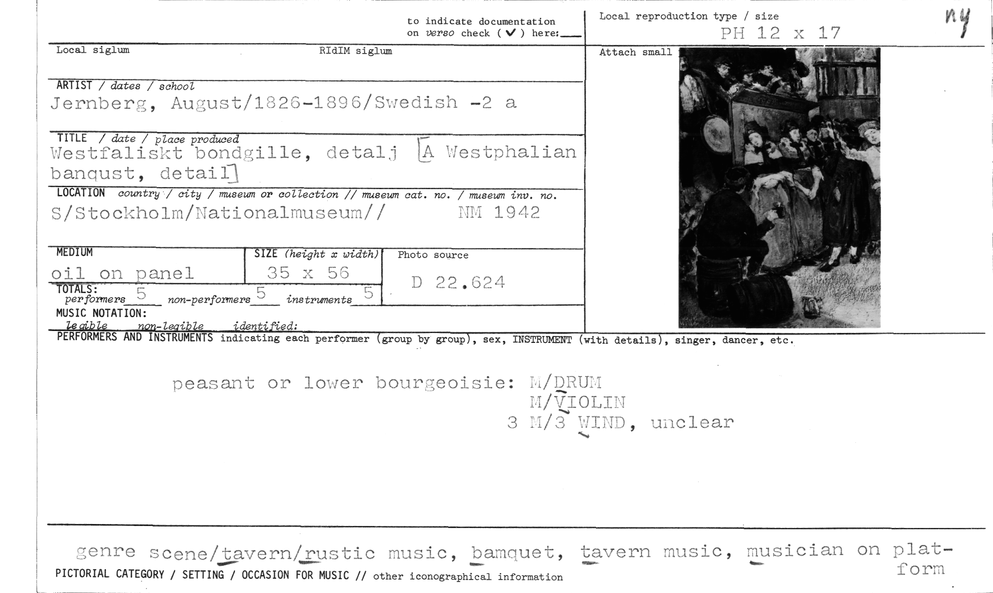 //// peasant or lover bourgeoisie: 14/DRUM //// M/ZIOLIN //// 3 M/3 WIND, unclear //// ti //// genre scene/tavern/rustic music, bamquet, tavern music, musician on plat- //// •=1. //// form //// PICTORIAL CATEGORY / SETTING / OCCASION FOR MUSIC // other iconographical information «Er. //// Attach small //// to indicate documentation //// on verso check (N/ ) here:_ //// Local reproduction type / size //// PI-I 12 x 17 //// Local siglum //// RIdIM siglum //// ARTIST / datas / achoot //// Jernberg, August/1826-1896/Swedish -2 a //// TITLE / date place produce //// Westfaliskt bondgille, detalj L Westphalian banqust, detail3 //// LOCATION country / city / museum or collection // museum cat. no. / museum inv. no. //// S/Stockholm/Nationalmuseum// NM 1942 //// MEDIUM //// SIZE (height x width) //// oil on panel 35 x 56 //// nua7 5 //// per formers R non-perfOrmers 5 instruments //// MUSIC NOTATION: //// cible non-leaible identified; //// D 22.624 //// FifFORMERS AND INSTRUMENTS indicating each performer (group by group), sex, INSTRUMENT (with details), singer, dancer, etc. //// Photo source ////