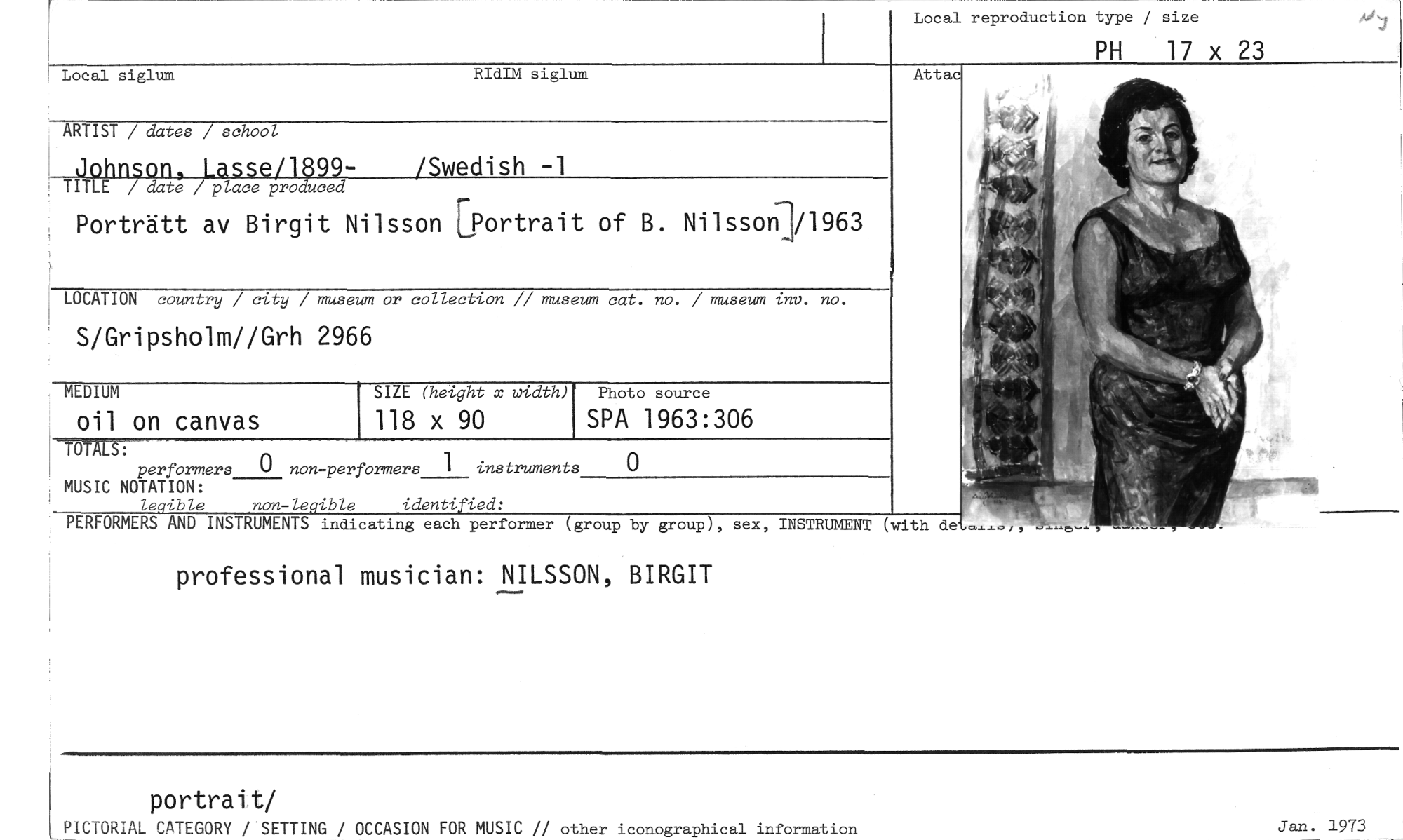 //// professional musician: NILSSON, BIRGIT //// portrait/ Jan. 1973 //// PICTORIAL CATEGORY / SETTING / OCCASION FOR MUSIC // other iconographical information //// //// Local reproduction type / size //// PH 17 x 23 //// Local siglum RIdIM siglum //// Johnson, Lasse/1899- /Swedish -1 //// TITLE / date / place produced //// Porträtt av Birgit Nilsson [Portrait of B. Nilsson/1963 //// LOCATION country / city / museum or collection // museum cat. no. / museum inv. no. //// S/Gripsholm//Grh 2966 //// SIZE (height x width) //// 118 x 90 //// performers //// MUSIC NOTATION: //// legible non-legible identified: //// PERFORMERS AND INSTRUMENTS indicating each performer (group by group), sex, INSTRUMENT (with de //// MEDIUM //// oil on canvas //// TOTALS: //// 0 //// Photo source //// SPA 1963:306 //// Attac //// non-performers 1 instruments 0 ////