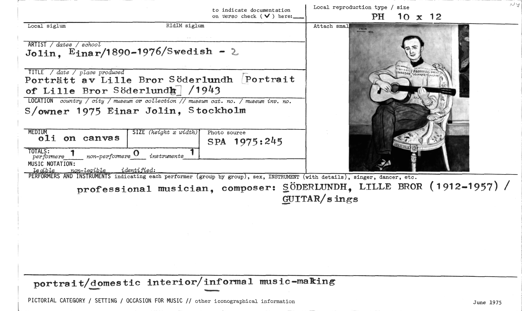 //// to indicate documentation //// on versa check (V ) here:_ //// Local reproduction type / size //// PH 10 x 12 //// Local siglum RIdIM siglum //// ARTIST / dates / school //// Jolin, Einar/1890-1976/Swedish //// TITLE / date / place produced //// Porträtt av Lille Bror Söderlundh Portrait of Lille Bror Söderlundb /1943 //// LOCATION country / city / museum or collection // museum cat. no. / museum inv. no. //// S/owner 1975 Einar Jolin, Stockholm //// Attach sma //// MEDIUM //// oli on canvas //// SIZE (height x width) //// Photo source //// SPA 1975:245 //// per formers 1 non-performers 0 instruments //// performer (group by group), sex, INSTRUMENT (with details), singer, dancer, etc. //// professional musician, composer: SöDERLUNDH, LILLE BROR (1912-1957) / //// GUITAR/sings //// TOTALS: //// MUSIC NOTATION: //// te db 7,e non-Zeaible identified; //// PERFORMERS AND INSTRUMENTS indicating each //// portrait/domestic interior/informal music-making //// PICTORIAL CATEGORY / SETTING / OCCASION FOR MUSIC // other iconographical information June 1975 ////