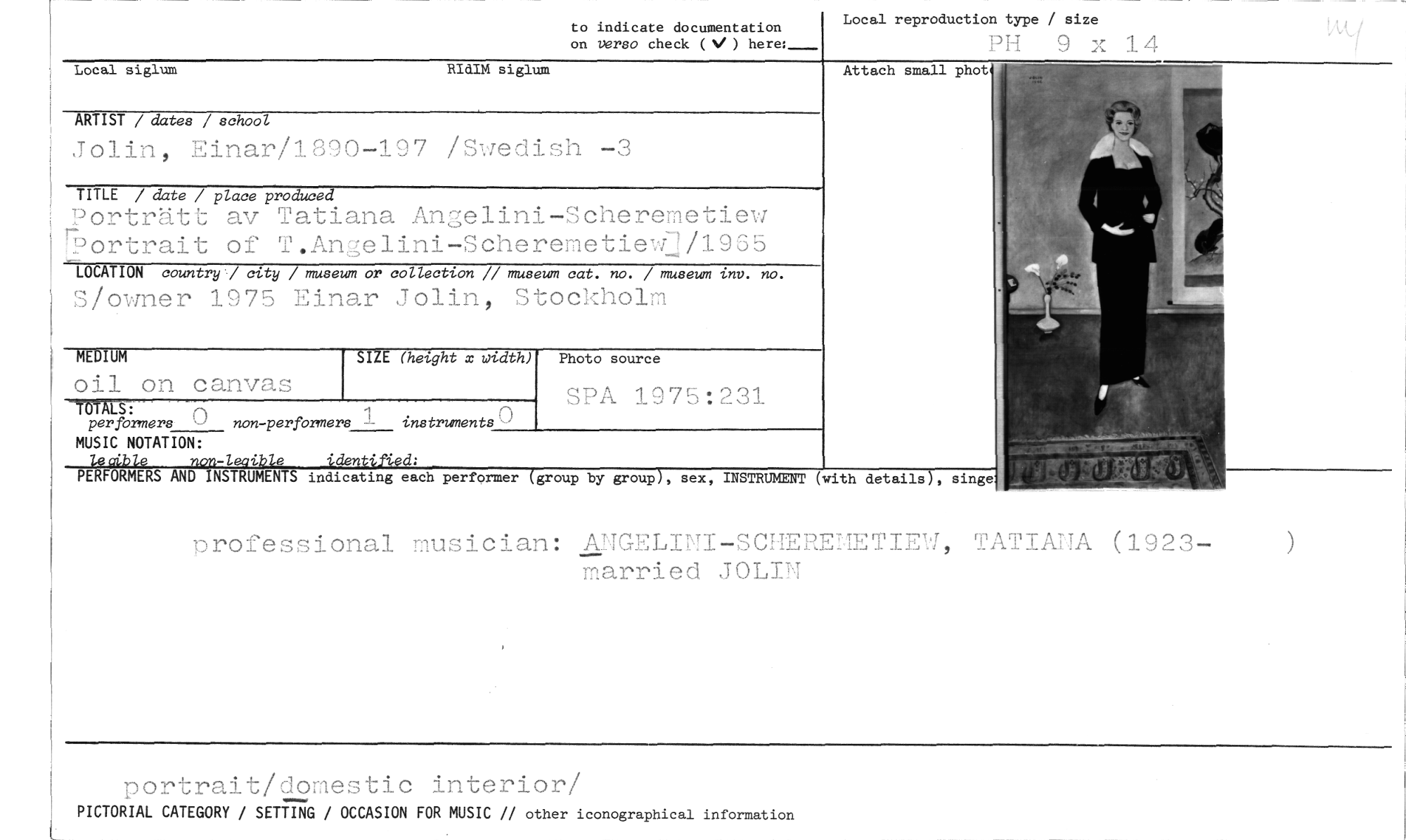 //// to indicate documentation //// on verso check (V ) here:___ //// Local reproduction type / size //// PH 9 x 14 //// Local siglum RIdIM siglum //// ARTIST / dates / school //// Jolin, Einar/1890-197 /Swedish -3 //// Attach small phot //// TITLE / date / place p;755J72 //// Porträtt av Tatiana Angelini-Scheremetiew :Portrait of T.Angelini-Scheremetiewi/1965 //// LOCATION country / city / museum or collection // museum cat. no. / museum mo. no. //// S/owner 1975 Einar Jolin, Stockholm //// MEDIUM SIZE (height x width) Photo source //// oil on canvas //// TOTALS: //// per formera- C) non-performers 1 instruments //// MUSIC NOTATION: //// 194,ble n072-leaible identified: //// PERFORMERS AND INSTRUMENTS indicating each performer (group by group), sex, INSTRUMENT (with details), singe //// mrofessional musician: ANGELIMI-SCHEREMETIEW, TATIANA (1923- //// married JOLIN //// portrait/domestic interior/ //// PICTORIAL CATEGORY / SETTING / OCCASION FOR MUSIC // other iconographical information //// SPA 1975:231 ////