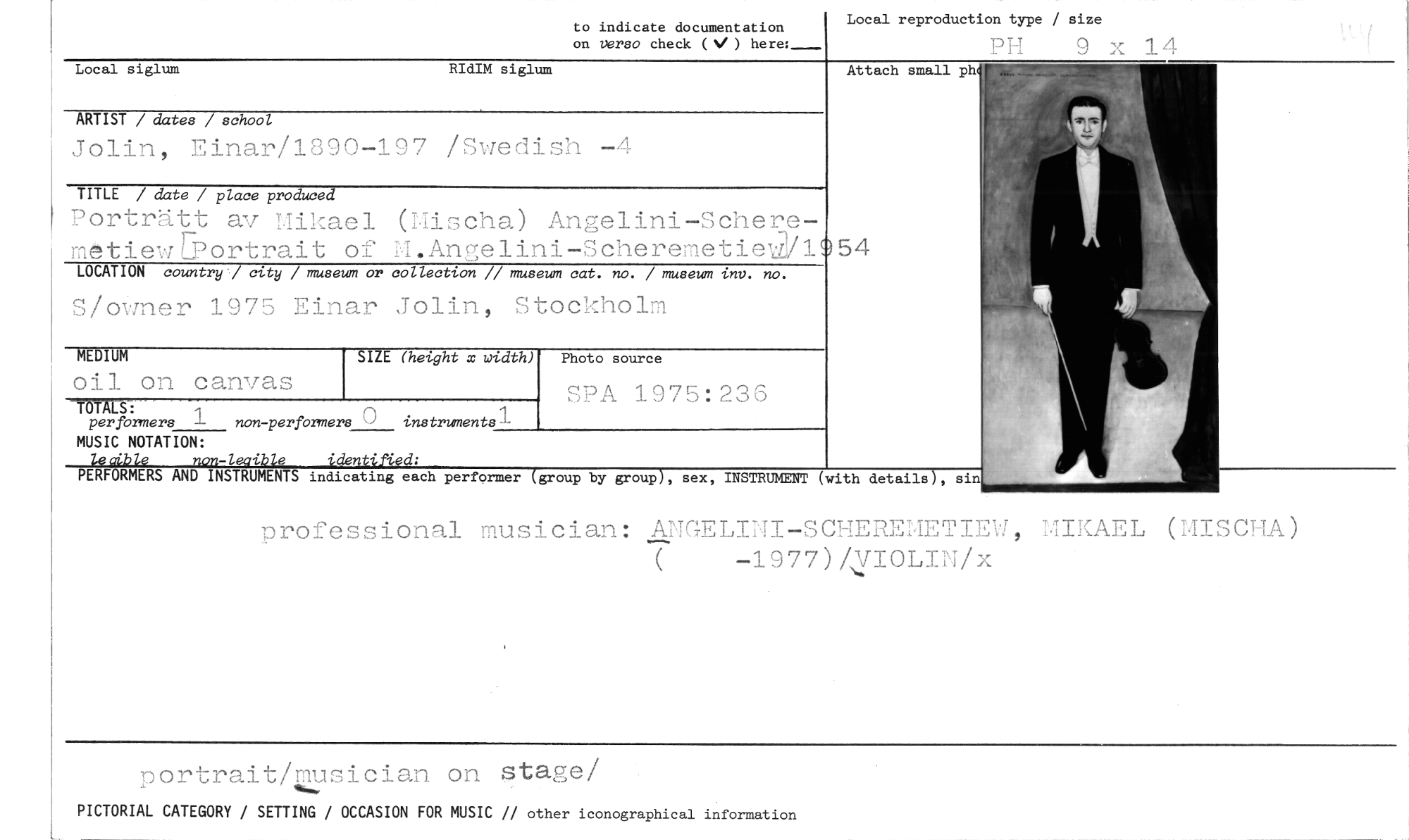 //// professional musician: ANGELIMI-SCHEREMETIEW, MIKAEL (MISCHA) //// -1977)4yIOLIN/x //// nortrait/musician on stage/ //// PICTORIAL CATEGORY / SETTING / OCCASION FOR MUSIC // other iconographical information //// Attach small ph //// TOTALS: //// per formers //// non-perfermers 0 instruments //// to indicate documentation //// on torso check (V) here:_ //// Local reproduction type / size //// PH //// RIdIM siglum //// Local siglum //// ARTIST / dates / school //// Jolin, Einar/1890-197 /Swedish -4 //// TITLE / date / place produced //// Porträtt av 'Mikael //// metiew[Portrait of //// LOCATION country' city / museum or //// S/owner 1975 Einar //// (Mischa) Angelini-SchereM.Angelini-Scheremetiekl //// collection // museum cat. no. / museum inv. no. //// Jolin, Stockholm //// 54 //// SIZE (height x width) //// PsPA 1975:236 //// MEDIUM //// oil on canvas //// Photo source //// MUSIC NOTATION: //// l845ible non -leaible identified: //// PERFORMERS AND INSTRUMENTS indicating each performer (group //// by groupY, sex, INSTRUMENT (with details), si ////