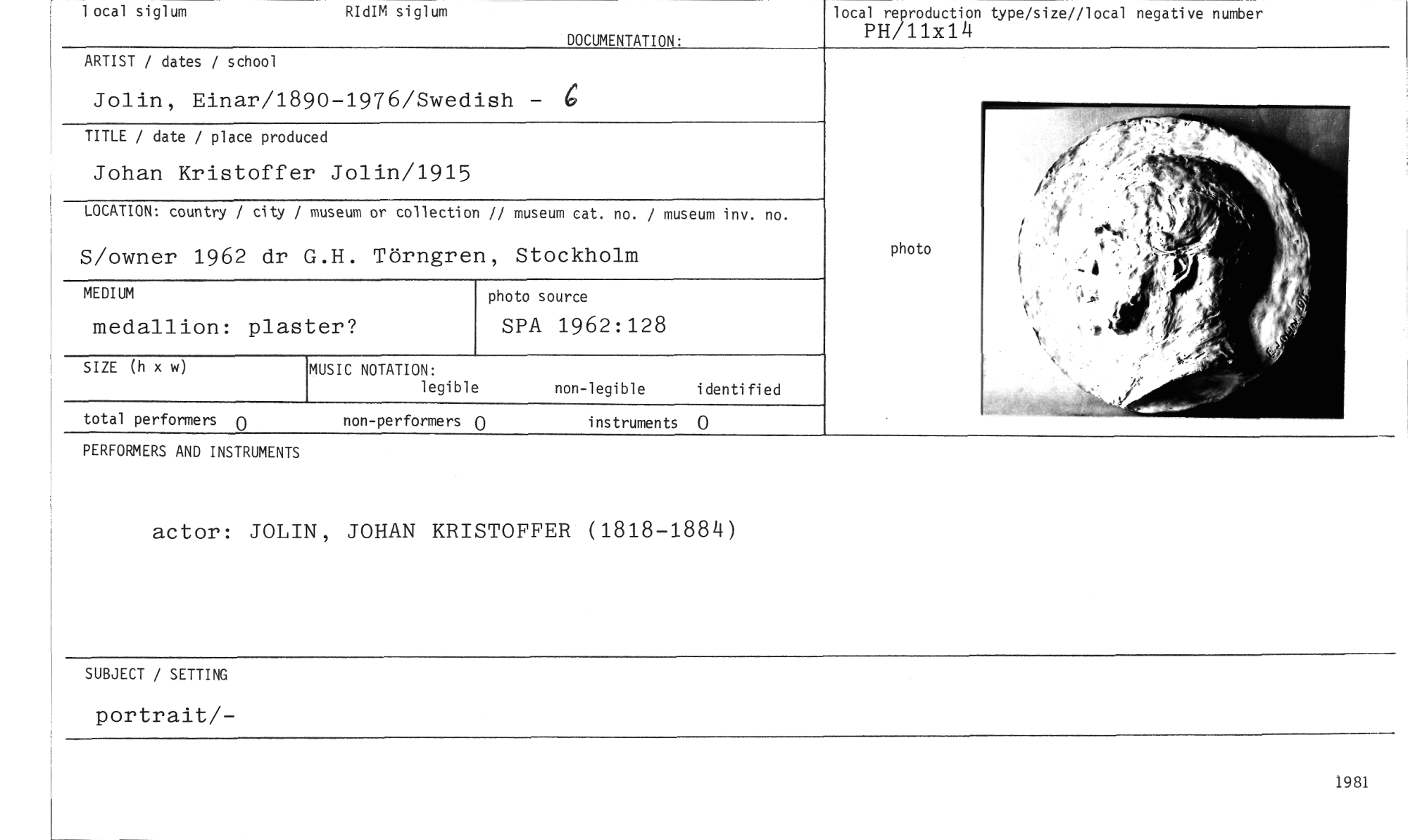 //// local siglum //// RIdIM siglum //// DOCUMENTATION: //// local reproduction type/size//local negative number //// PH/11x14 //// ARTIST / dates / school //// Jolin, Einar/1890-1976/Swedish - 6 //// TITLE / date / place produced //// Johan Kristoffer Jolin/1915 //// LOCATION: country / city / museum or collection // museum cat. no. / museum inv. no. //// S/owner 1962 dr G.H. Törngren, Stockholm //// photo //// photo source //// SPA 1962:128 //// SIZE (h x w) //// MUSIC NOTATION: //// legible //// non-legible identified //// total performers 0 //// non-performers 0 instruments 0 //// PERFORMERS AND INSTRUMENTS //// actor: JOLIN, JOHAN KRISTOFFER (1818-1884) //// SUBJECT / SETTING //// portrait/- //// 1981 ////