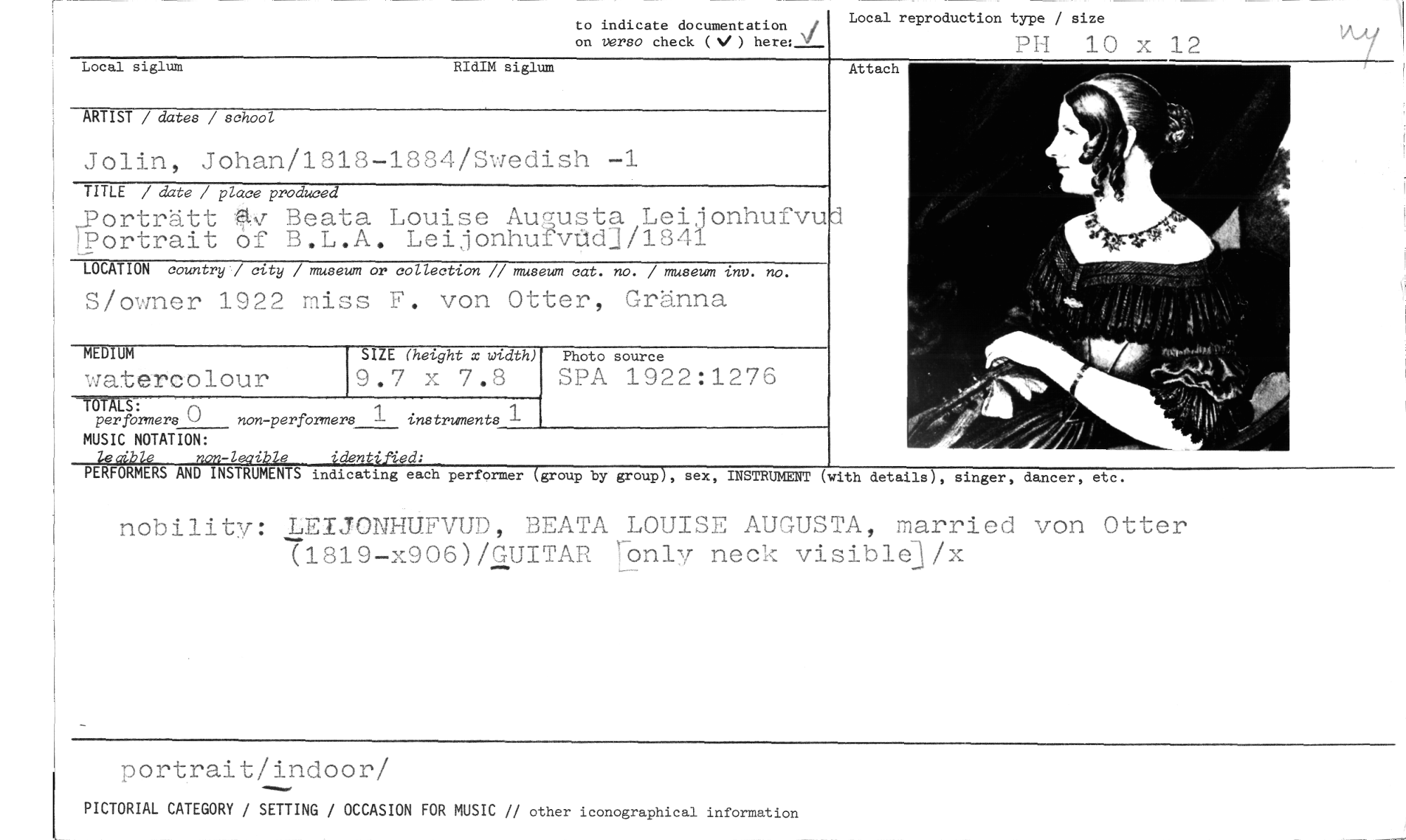 //// to indicate documentation //// Local reproduction type / size //// 4 //// on verso check (V) here: 2L, PH 10 x 12 //// Local siglum RIdIM siglum //// ARTIST / dates / school //// Jolin, Johan/1818-1884/Swedish -1 //// TITLE / date / place produced //// orträtt ft..,J Beata Louise Augusta Leijonhufvud Portrait of B.L.A. Leijonhufvtdj/1841 //// LOCATION country / city / museum or collection // museum cat. no. / museum inv. no. //// Slowner 1922 miss F. von Otter, Gränna //// MEDIUM //// watercolour //// TOTALS: n 1 instruments //// perfbrmers non-performers //// MUSIC NOTATION: //// lecible nnn-leaible identified: //// PERFORMERS AND INSTRUMENTS //// SIZE (height x width) //// 9.7 x 7.8 //// Photo source //// 31:3A 1922:1276 //// Attach //// indicating each performer (group by group), sex, INSTRUMENT (with details), singer, dancer, etc. //// nobility: LEIJONHUFVUD, BEATA LOUISE AUGUSTA, married von Otter (1819-x906)/GUITAR Nnly neck visible3/x //// portrait/indoor/ //// PICTORIAL CATEGORY / SETTING / OCCASION FOR MUSIC // other iconographical information ////