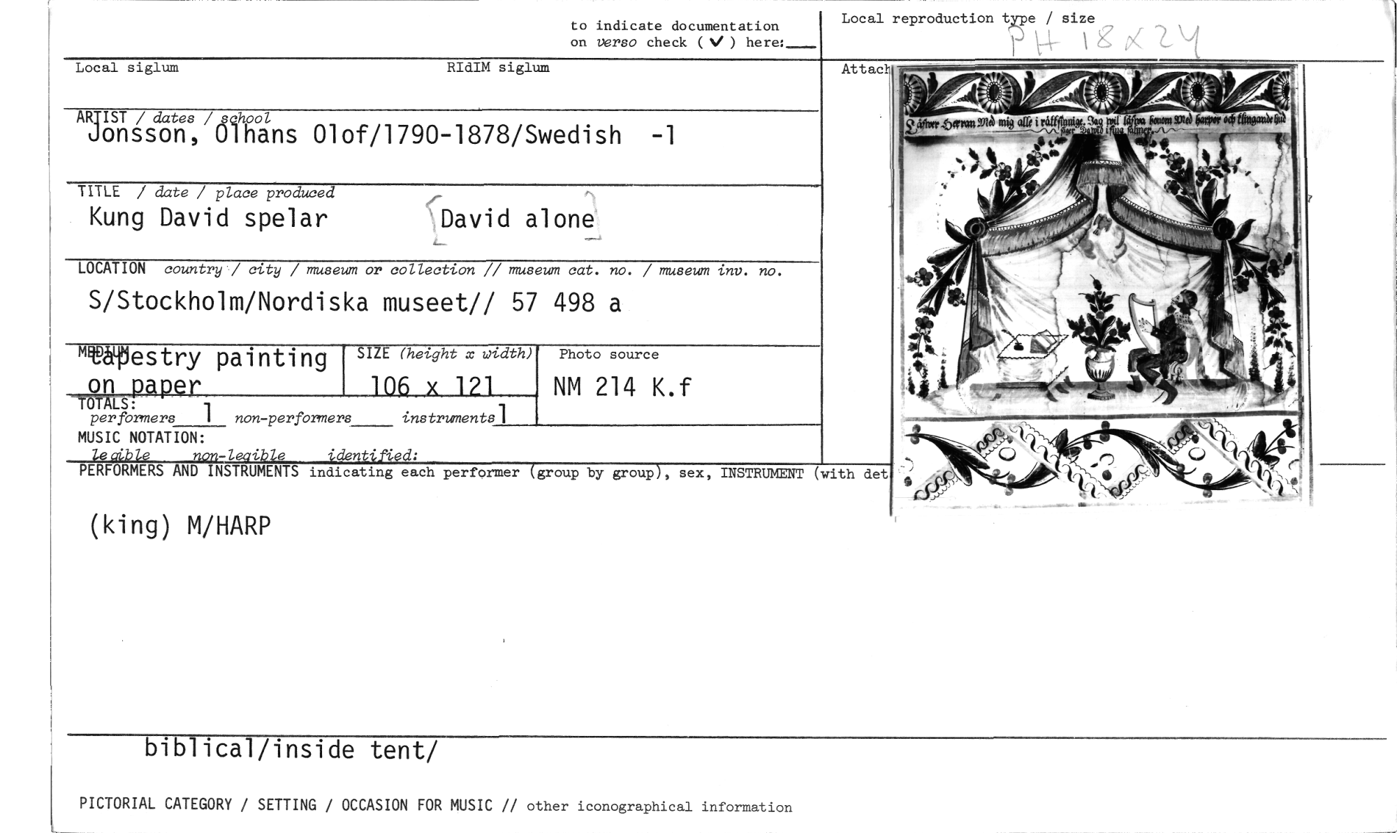 //// to indicate documentation //// on versa check (N/ ) here:__-- //// Local reproduction type / size //// Local siglum RIdIM siglum //// Attack' //// AR IST / dates /vchool //// Jonsson, Olhans Olof/1790-1878/Swedish -1 //// TITLE date / place produced //// Kung David spelar //// David alone //// LOCATION country / city / museum or collection // museum cat. no. / museum inv. no. //// S/Stockholm/Nordiska museet// 57 498 a //// m'Westry painting //// Photo source //// SIZE (height x width) //// 106 x 121 //// -49 g41122-e- //// per formers 1 non-performers instruments] //// 1 //// NM 214 K.f //// MUSIC NOTATION: //// le aibl non-leoible identified: //// PERFORMERS AND INSTRUMENTS indicating each performer (group by group), sex, INSTRUMENT //// (with det //// (king) M/HARP //// biblical/inside tent/ //// PICTORIAL CATEGORY / SETTING / OCCASION FOR MUSIC // other iconographical information ////