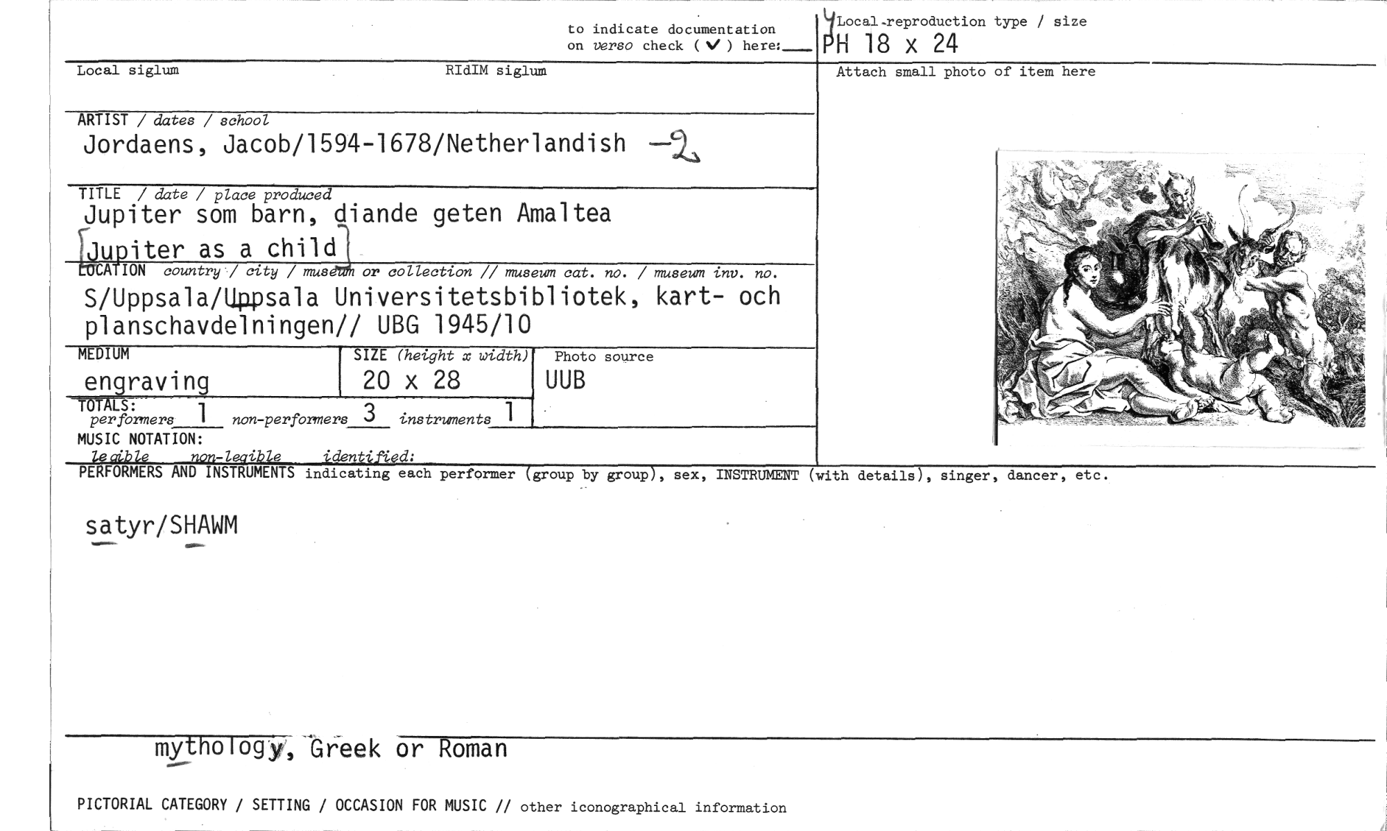 //// to indicate documentation on verso check ( ) here: //// Local-reproduction type / size //// H 18 x 24 //// Local siglum RIdIM siglum //// ARTIST / dates / school //// Jordaens, Jacob/1594-1678/Netherlandish //// TITLE / date / place produced //// Jupiter som barn, (Ilande geten Amaltea //// Jupiter as a child //// ATM country i city / muser or collection // museum cat. no. / museum im no. //// S/Uppsala/Uppsala Universitetsbibliotek, kart- och planschavdelningen// UBG 1945/10 //// ttach small photo of item here //// MEDIUM //// engraving //// -TOTÅLS: //// per formers //// 1 //// MUSIC NOTATION: leaible non-lesible PERFORMERS AND INSTRUMENTS //// satyr/SHAWM SIZE (height x width) //// 20 x 28 //// identified; //// indicating each performer (group by group), sex, INSTRUMENT (with details), singer, dancer, etc. //// Photo source //// UUB //// non-perfbrmers 3 instruments 1 //// mythology, Greek or Roman //// PICTORIAL CATEGORY / SETTING / OCCASION FOR MUSIC // other iconographical information ////