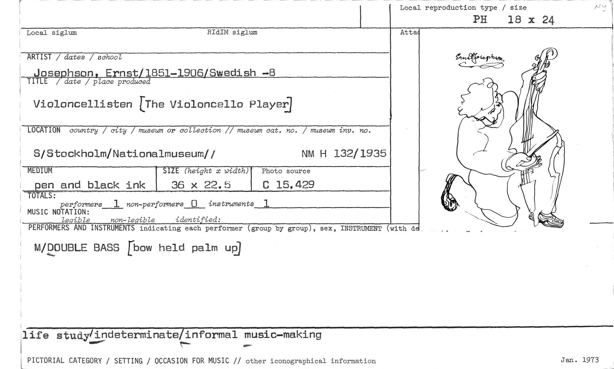 //// Local reproduction type / size //// PH 18 x 24 //// S/Stockholm/Nationalmuseum// //// NM H 132/1935 //// Jan. 1973 //// PICTORIAL CATEGORY / SETTING / OCCASION FOR MUSIC // other iconographical information //// I Local siglum RIdIM siglum //// ARTIST / dates / school //// Josephson, Ernst/1851-1906/Swedish -8 //// TITLE / date / place produced //// Violoncellisten [The Violoncello Played //// LOCATION country / city / museum or collection // museum cat. no. / museum inv. no. //// SIZE (height x width) //// 36 x 22.b //// TUTAM //// 1 //// M/DOUBLE BASS Ebow held palm upJ //// Åtta( //// MEDIUM //// pen and black ink //// performers i non -performers 0 instruments //// MUSIC NOTATION: //// legible non-legible identified: //// PERFORMERS AND INSTRUMENTS indicating each performer (group by //// group), sex, INSTRUMENT (with de //// Photo source //// C 15.429 //// life studylindeterminate/informal music-making //// r- ////