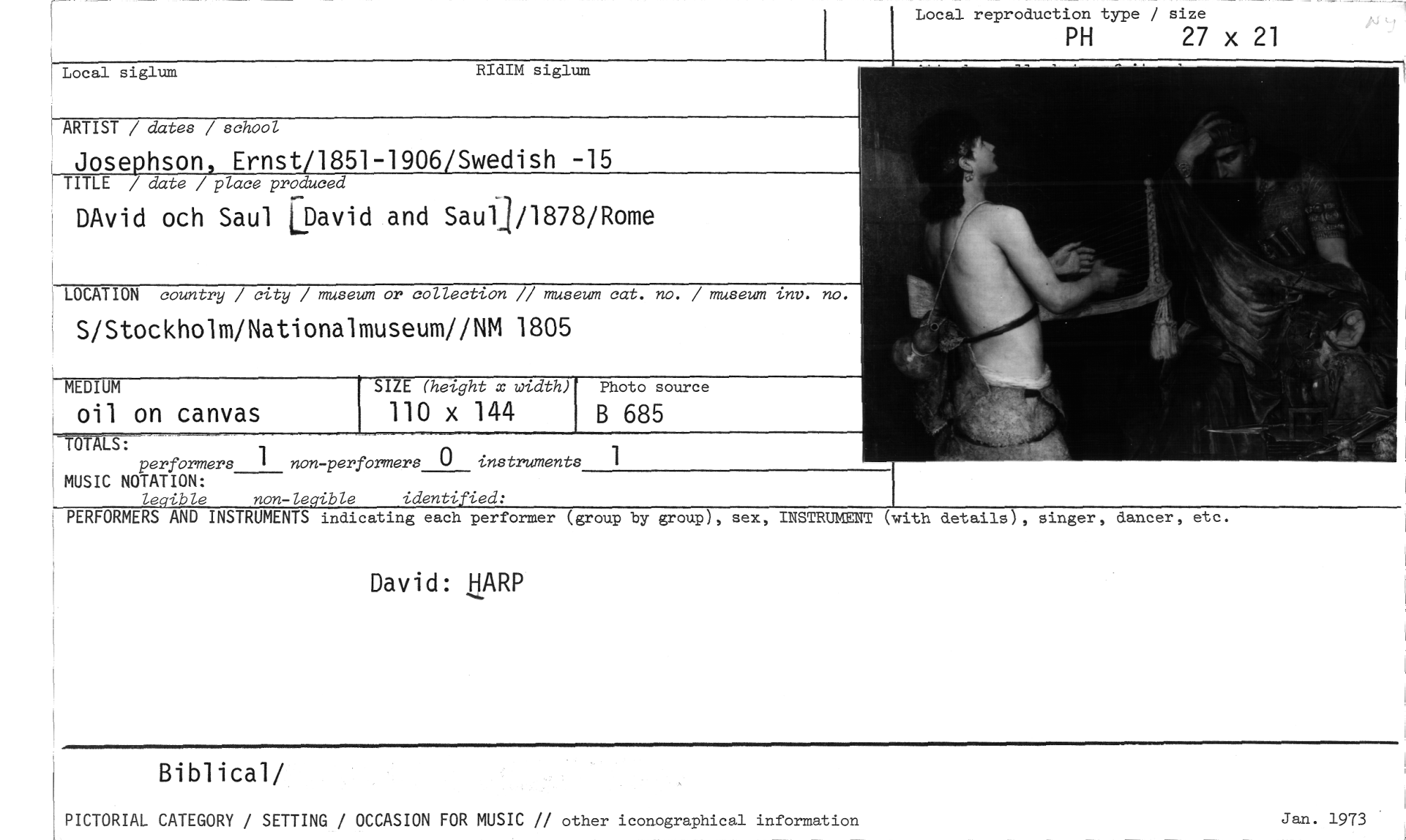 //// David: HARP //// (group by group), sex, //// INSTRUMENT (with details), singer, dancer, etc. //// PERFORMERS AND INSTRUMENTS indicating each performer //// Local reproduction type / size //// PH 27 x 21 //// Local siglum RIdIM siglum //// ARTIST / dates / school //// Josephson, Ernst/1851-1906/Swedish -15 //// TITLE / date / place produced //// DAvid och Saul LDavid and Sau11/1878/Rome //// LOCATION country / city / museum or collection // museum cat. no. / museum tnv. no. //// S/Stockholm/Nationalmuseum//NM 1805 //// MEDIUM //// oil on canvas //// TOT LS: //// perprmers 1 non-perPrmers 0 instruments MUSIC NOTATION: //// leqible non-legible identified: //// 1 //// Biblical/ //// PICTORIAL CATEGORY / SETTING / OCCASION FOR MUSIC // other iconographical information Jan. 1973 ////