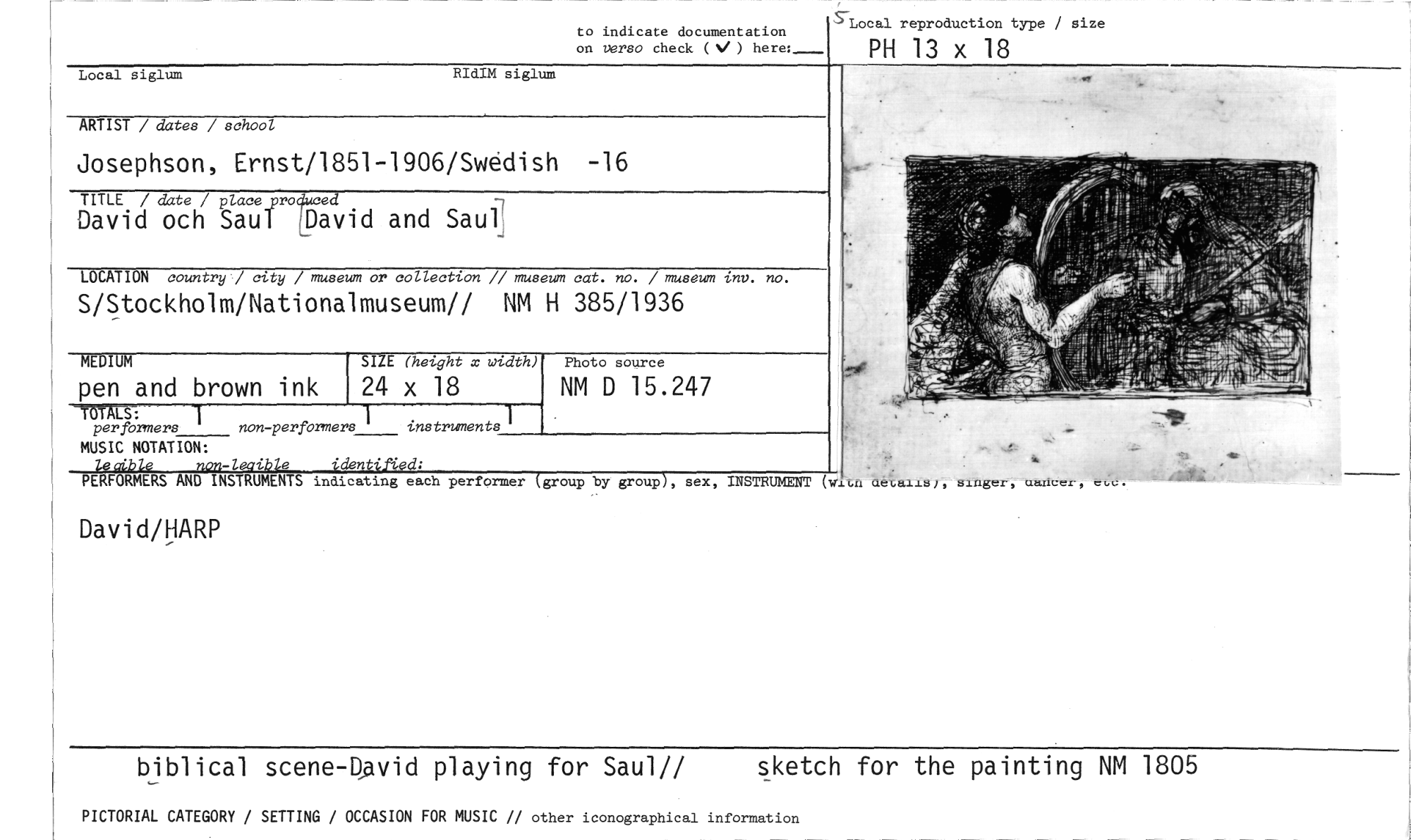 //// to indicate documentation on verso check ( ) here: //// Local reproduction type / size //// PH 13 x 18 //// Local siglum RIdIM siglum //// ARTIST / dates / school //// Josephson, Ernst/1851-1906/Swedish -16 //// TITLE / date / place_prodmeed //// David och Saul !David and Saul' //// LOCATION country / city / museum or collection // museum cat. no. / museum tnv. no. //// S/Stockholm/Nationalmuseum// NM H 385/1936 //// MEDIUM //// pen and brown ink //// -MALS: //// per formers non-perprmers instruments' //// MUSIC NOTATION: //// ' !I ffl - e "den 'ed; //// SIZE (height x width) //// 24 x 18 //// Photo source //// NM D 15.247 //// PERFORMERS AND INSTRUMENTS indicating each performer (group by group), sex, INSTRUMENT (w,en detaiis), singer, cari.er, //// David/HARP //// biblical scene-Dvid playing for Saul// sketch for the painting NM 1805 //// PICTORIAL CATEGORY / SETTING / OCCASION FOR MUSIC // other iconographical information ////