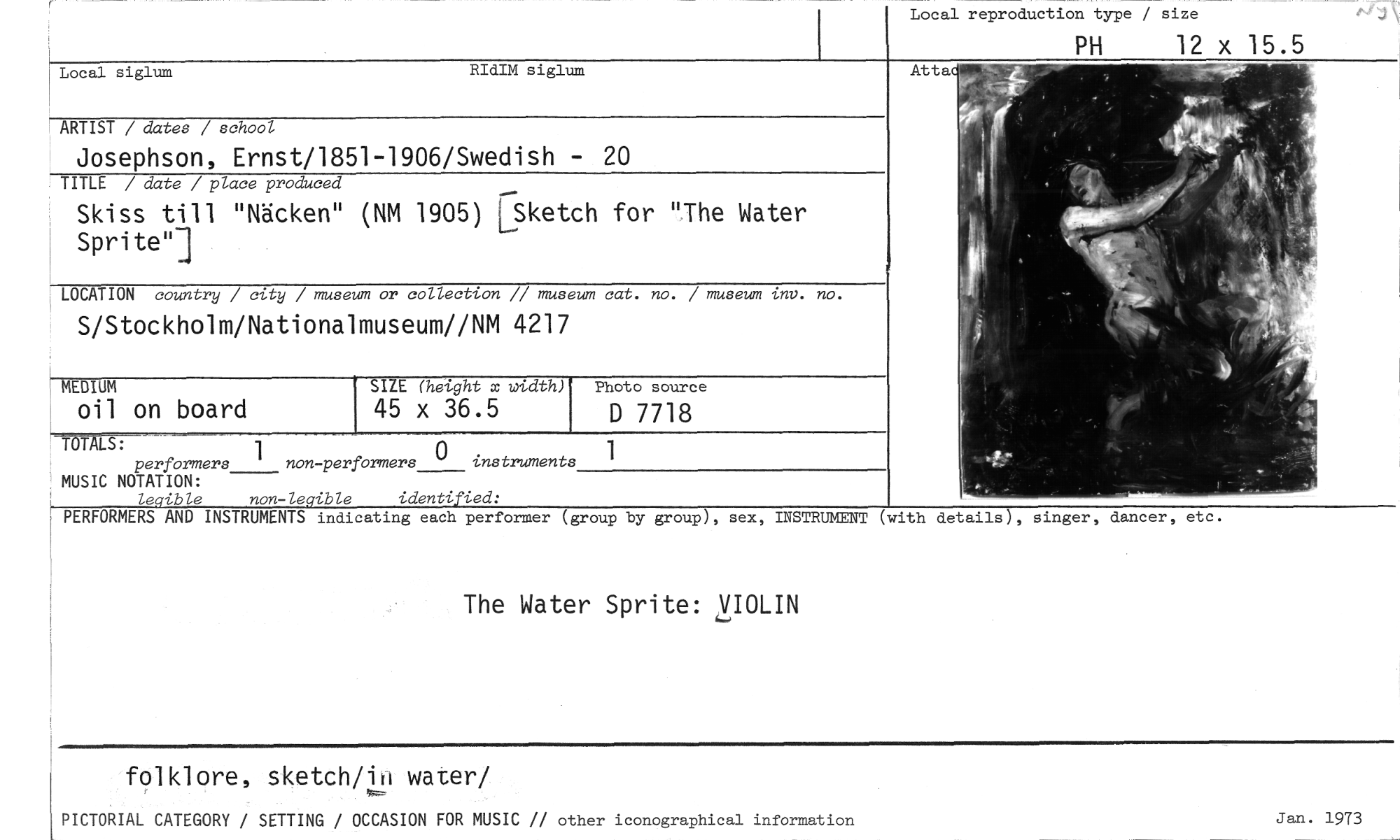 //// Local reproduction type / size //// PH 12 x 15.5 //// Local siglum RIdIM siglum //// Åtta //// ARTIST / dates / school //// Josephson, Ernst/1851-1906/Swedish - 20 //// TITLE / date / place produced //// Skiss till "Näcken" (NM 1905) [Sketch for "The Water Spriten] //// LOCATION country / city / museum or collection // museum cat. no. / museum inv. no. //// S/Stockholm/Nationalmuseum//NM 4217 //// MEDIUM //// oil on board //// Photo source //// SIZE (height x width) //// 45 x 36.5 //// D 7718 1 //// TÖTALS: //// 1 //// performers non-performers 0instruments //// MUSIC NOTATION: //// Legible non-legible identified: //// PERFORMERS AND INSTRUMENTS indicating each performer (group by group), sex, INSTRUMENT (with details), singer, dancer, etc. //// The Water Sprite: VIOLIN //// folklore, sketch/in water/ //// PICTORIAL CATEGORY / SETTING / OCCASION FOR MUSIC // other iconographical information //// Jan. 1973 ////