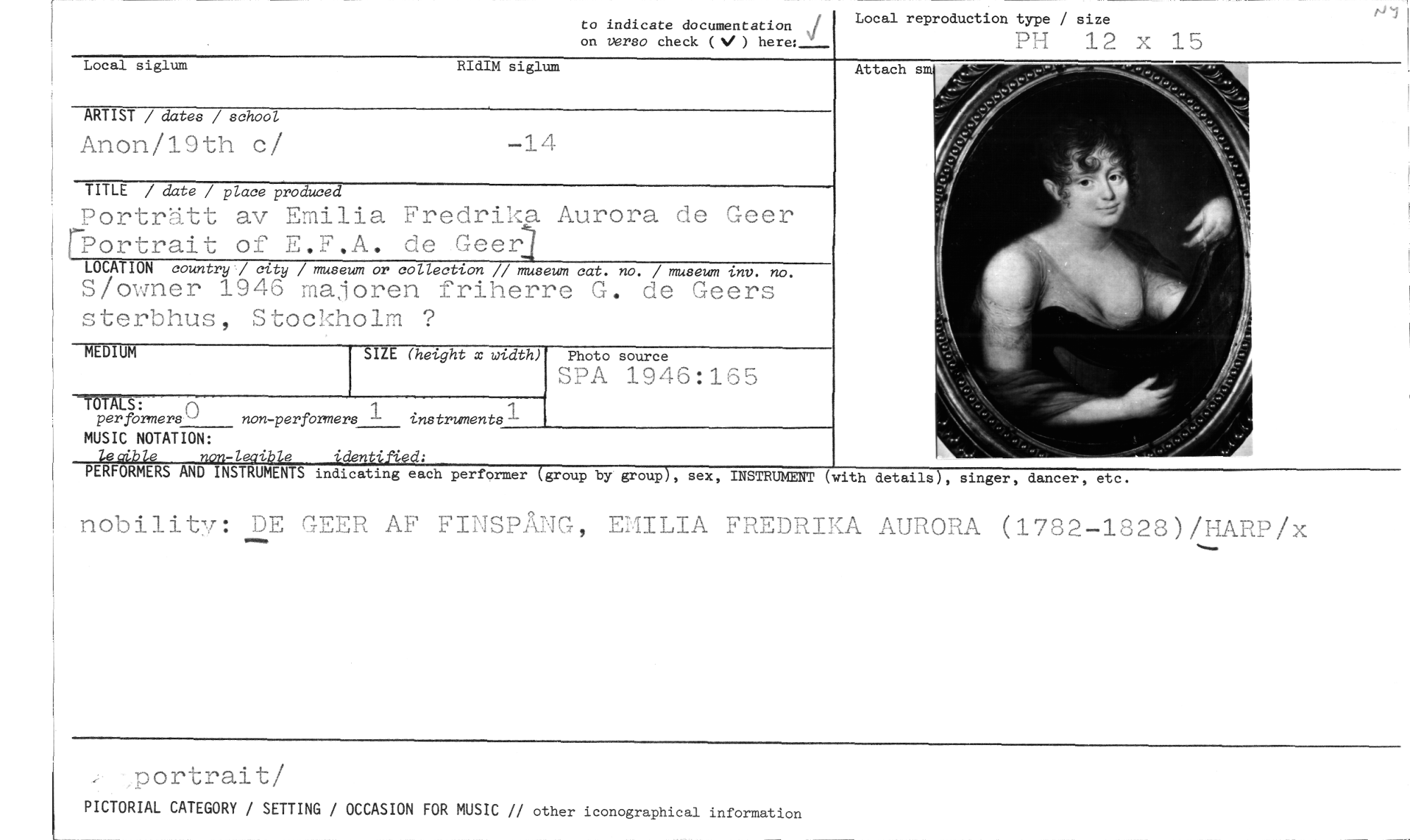 //// to indicate documentation / on verso check (V ) //// Local reproduction type / size //// 7)7..' 12 x 15 //// Local siglum RIdIM siglum //// ARTIST / dates / school //// Anon/19th c/ -14 //// TITLE / date / place produced //// Porträtt av Emilia Fredrika Aurora de Geer rPortrait of E.F.A. de Geer //// LOCATION country / city / museum or collection // museum cat. no. / museum inv. no. //// S/owner 1946 majoren friherre G. de Geers sterbhus, Stockholm ? //// MEDIUM //// 1 instruments //// MUSIC NOTATION: //// le aible non-lecible identilied; //// PERFORMERS AND INSTRUMENTS indicating each performer (group by group), sex, INSTRUMENT //// (with details), singer, dancer, etc. //// SALS: //// per forners non-perforners //// SIZE (height x width) //// Photo source //// SPA 1946:165 //// nobility: DE GEER AF FITTSPANG, =ELIA FREDRIKA AURORA (1782-1828)/HARP/x //// portrait/ //// PICTORIAL CATEGORY / SETTING / OCCASION FOR MUSIC // other iconographical information ////
