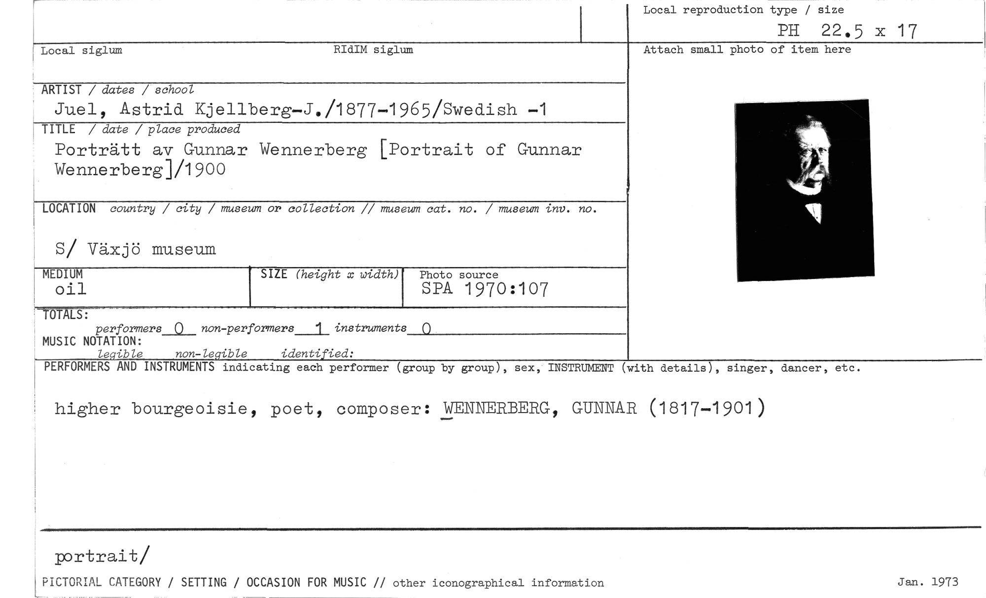 //// Local reproduction type / size //// PH 22.5 x 17 //// Attach small photo of item here //// Local siglum RIdIM siglum //// ARTIST / dates / school //// Juel, Astrid Kjellberg—J./1877-1965/Swedish —1 //// TITLE / date / place produced //// Porträtt av Gunnar Wennerberg [Portrait of Gunnar Wennerberg]/1900 //// LOCATION country / city / museum or collection // museum cat. no. / museum inv. no. //// S/ Växjö museum //// Photo source //// SPA 1970:107 //// TOTALS: //// performers 0 non-performers_l_ instruments //// MUSIC NOTATION: //// legible non-legible identified: //// MEDIUM Oil //// SIZE (height x width) //// 0 //// PERFORMERS AND INSTRUMENTS indicating each performer (group by group), sex, INSTRUMENT (with details), singer, dancer, etc. //// higher bourgeoisie, poet, composer: WENNERBERG, GUNNAR (1817-1901) //// portrait/ //// PICTORIAL CATEGORY / SETTING / OCCASION FOR MUSIC // other iconographical information Jan. 1973 ////