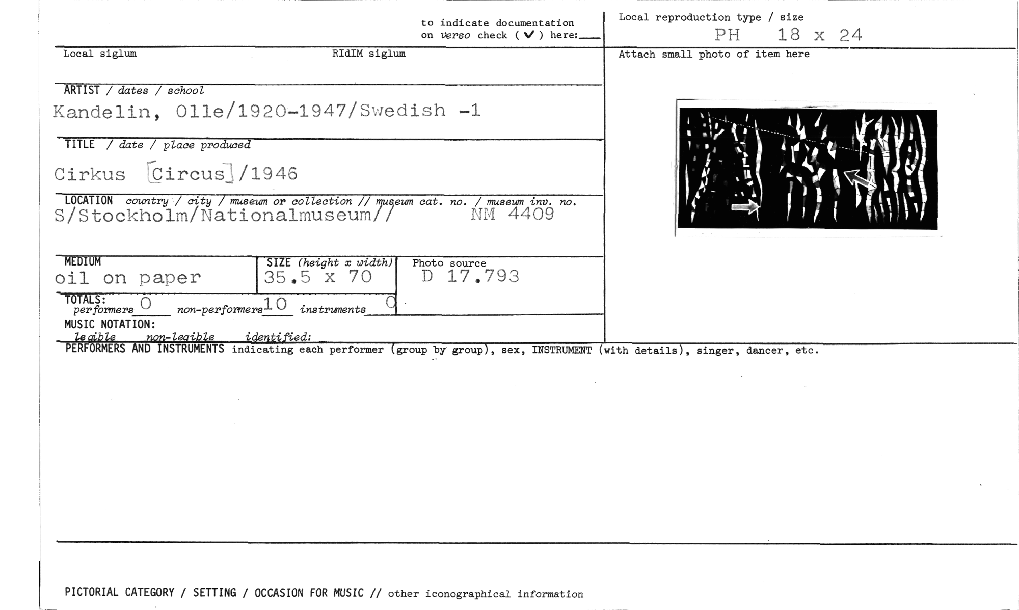 //// to indicate documentation //// on verso check (V ) here:_ //// PH 18 x 24 //// Local reproduction type / size //// Local siglum RIdIM siglum //// ARTIST / dates / school //// Kandelin, 011e/1920-1947/Swedish -1 //// TITLE / date / place produced //// Cirkus Circus-U1946 //// LOCATION country / city / museum or collection // nugeum cat. no. / museum tnv. no. //// S/Stockholm/Nationalmuseum// NM 4409 //// Attach small photo of item here //// MEDIUM //// oil on paper //// SIZE (height x width) //// 35.5 x 70 //// Photo source //// D 17.793 //// per formers (1) non-perfbrmers instruments //// MUSIC NOTATION: //// Zeaible non-lepible identified: //// PERFORMERS AND INSTRUMENTS indicating each performer (group by group), sex, INSTRUMENT (with details), singer, dancer, etc. //// MALS: //// PICTORIAL CATEGORY / SETTING / OCCASION FOR MUSIC // other iconographical information ////