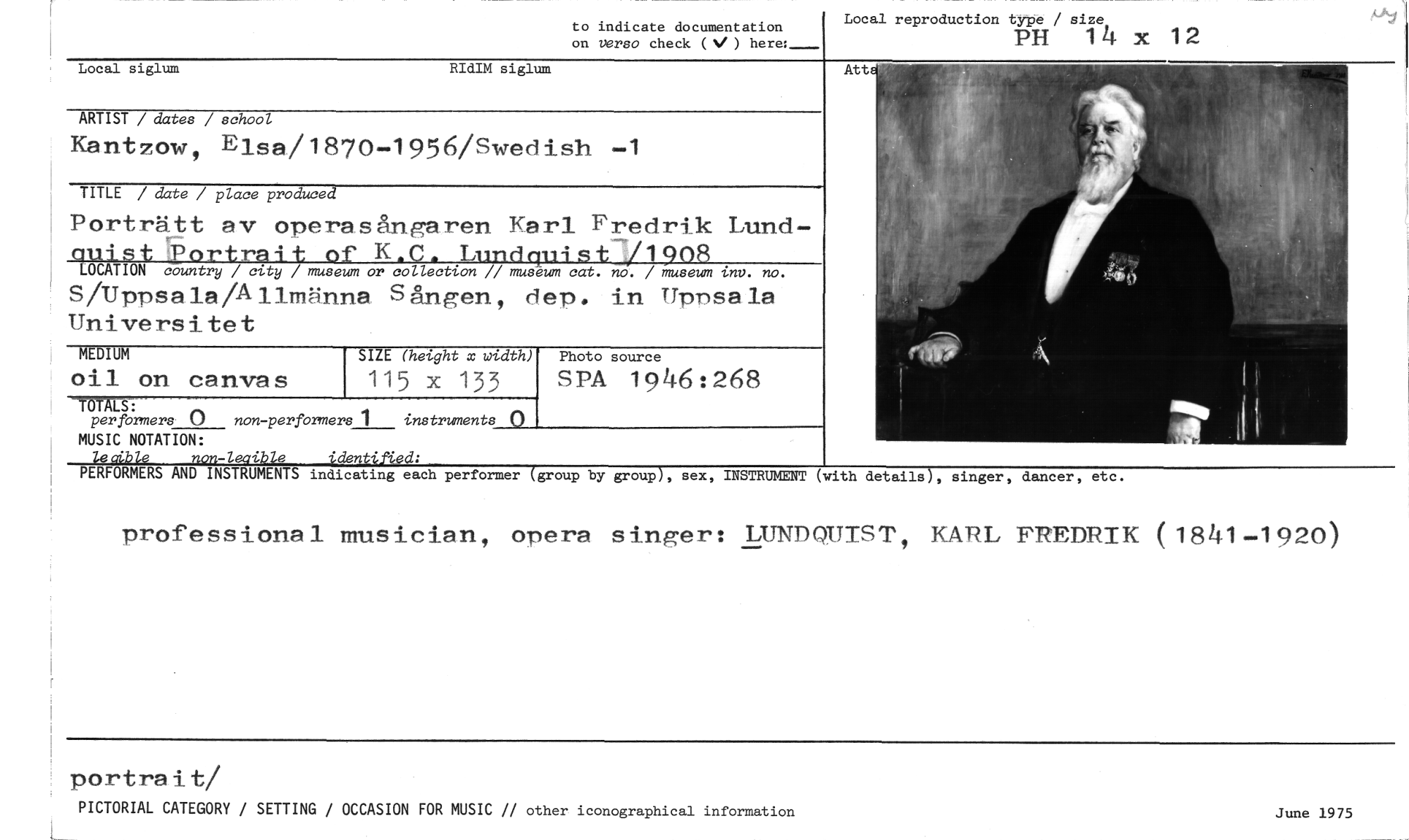 //// to indicate documentation //// on versa check (V ) here:— //// Local reproduction type / size //// PH 14 x 12 //// Local siglum RIdIM siglum //// ARTIST / dates / school //// Kantzow, Elsa/1870-1956/Swedish -1 //// TITLE / date / place produced //// Porträtt av operasångaren Karl Fredrik Lund- //// ' Auist Portrait of K.C. Lundquis±j:Un8___ //// LOCATION country / city / museum or collection // museum cat. no. / museum inv. no. //// S/Uppsala/Allmänna Sången, dep. in Uprsala Universitet //// MEDIUM canvas SIZE (height x width) Photo source //// oil on 115 x 133 SPA 1946:268 //// ToTAls: 0 non-performers 1 instruments () //// per formers //// MUSIC NOTATION: //// leedale non-leaible identiAcd: //// PERFORMERS AND INSTRUMENTS indicating each performer (group by group), sex, INSTRUMENT (with details), singer, dancer, etc. //// professional musician, opera singer: LUNDQUIST, KARL FREDRIK (1841-1920) //// Att //// portrait/ //// PICTORIAL CATEGORY / SETTING / OCCASION FOR MUSIC // other iconographical information //// Sune 1975 ////