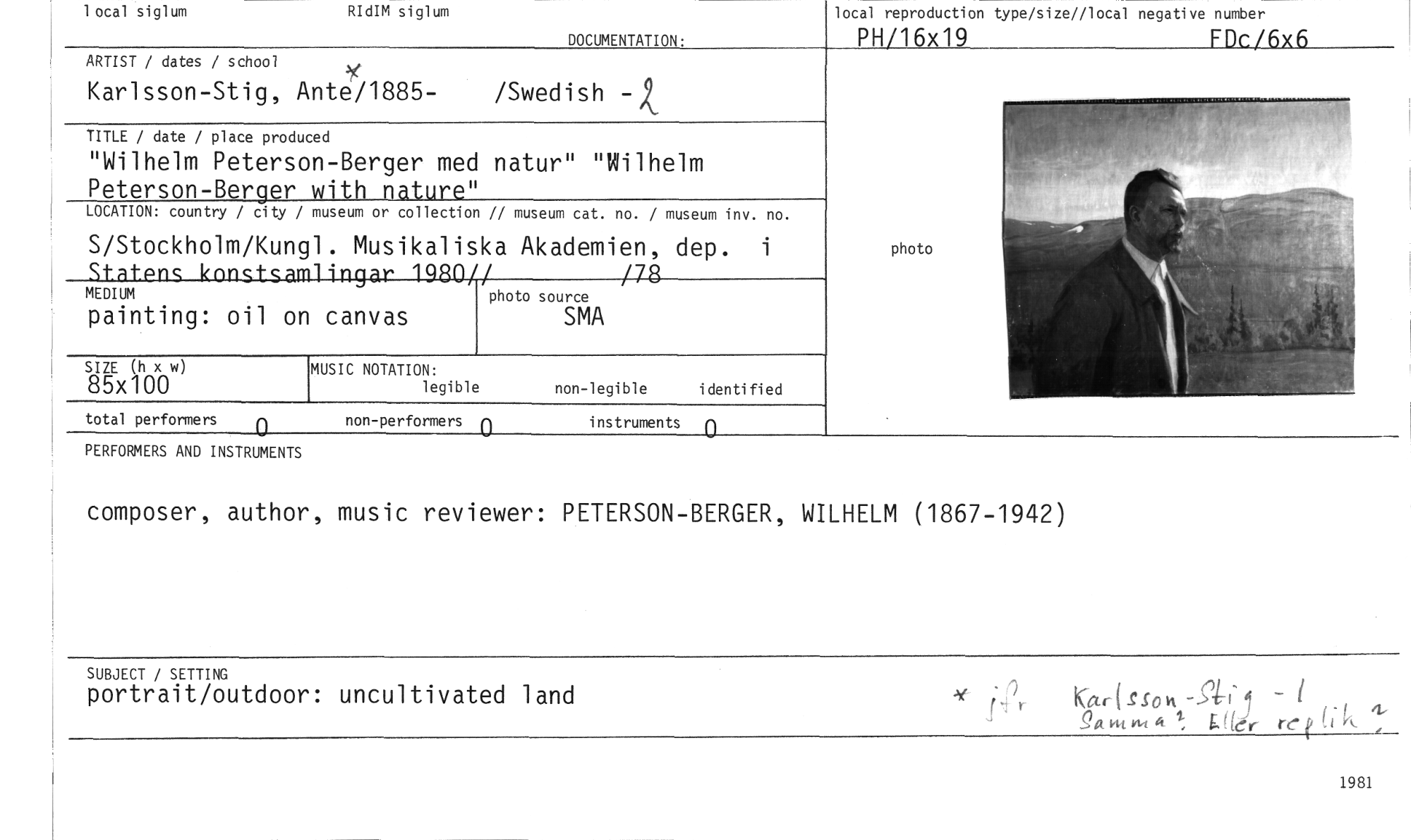 //// local reproduction type/size//local negative number //// PH/16x19 FDc/6x6 //// 1 ocal siglum RIdIM siglum //// DOCUMENTATION: //// ARTIST / dates / school //// Karlsson-Stig, AnteY //// /1885- /Swedish //// TITLE / date / place produced //// "Wilhelm Peterson-Berger med natur" "Wilhelm //// Peterson-Berger with nature" //// //// LOCATION: country / city / museum or collection // museum cat. no. / museum inv. no. //// S/Stockholm/Kungl. Musikaliska Akademien, dep. i //// Stat2nslwastsamlingar 1980// /78 //// MEDIUM photo source //// painting: oil on canvas SMA //// //// SIZE (h x w) MUSIC NOTATION: //// 85x100 legible non-legible i denti fi ed //// //// //// photo //// total performers 0 non-performers 0 instruments 0 //// //// PERFORMERS AND INSTRUMENTS //// composer, author, music reviewer: PETERSON-BERGER, WILHELM (1867-1942) //// SUBJECT / SETTING Kar ( gsoll i ti //// portrait/outdoor: uncultivated land 964.14t vw a 1; ((er re. //// 1981 ////