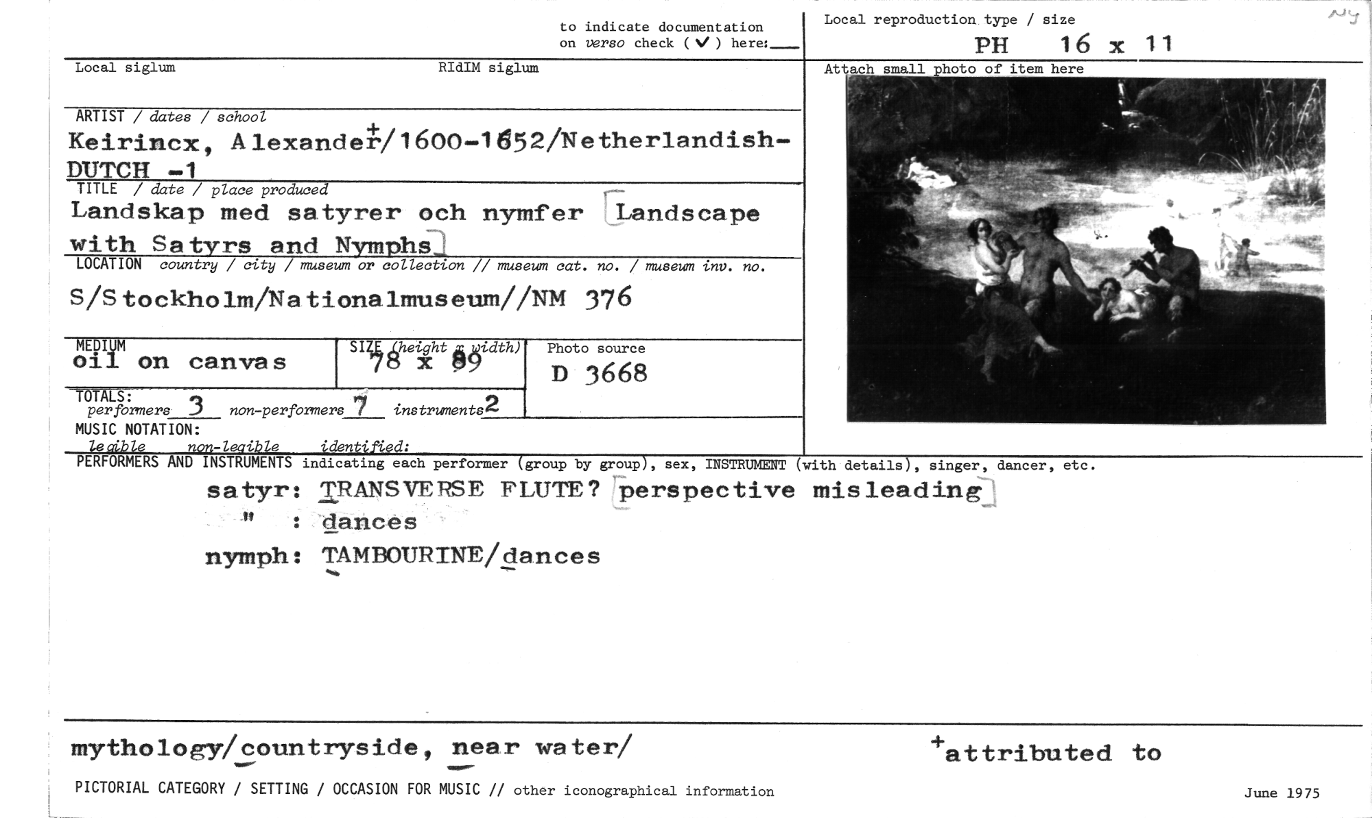//// to indicate documentation on versa check (V ) here: //// Local reproduction type / size //// PH 16 x 11 //// Local siglum RIdIM siglum //// ARTIST / dates / school //// Keirincx, Alexandet/1600-1652/NetherlandishDUTCH -1 //// TITLE / date / place produced //// Landskap med satyrer och nymfer Landscape with Sa tyrs and NymphS-1 //// LOCATION country / city / museum or collection // museum cat. no. / museum inv. no. //// S/Stockholm/Nationalmuseum//NM 376 //// nom //// oil on canvas //// TIT 3 non-performers 7 instruments //// MUSIC NOTATION: //// le aible non-leaible identified: //// PERFORMERS AND INSTRUMENTS indicating each performer (group by group), sex, INSTRUMENT (with details), singer, dancer, etc. //// satyr: TRANSVERSE FLUTE? perspective misleading: er : dances //// nymph: TAMHOURINE/dances //// mythology/countryside, near water/ +attributed to //// Lheight idth) //// Vd X M9 //// Photo source //// D 3668 //// PICTORIAL CATEGORY / SETTING / OCCASION FOR MUSIC // other iconographical information June 1975 ////